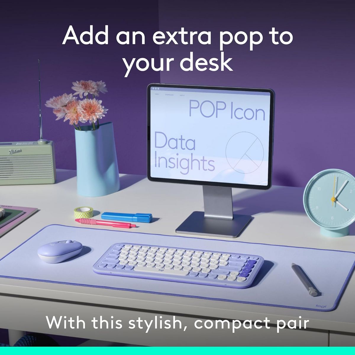 Logitech - POP ICON COMBO Compact TKL Bluetooth Keyboard and Mouse Bundle with Programmable Quiet Keys and Buttons - Lilac & Off-White