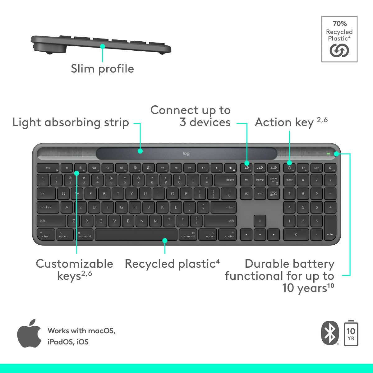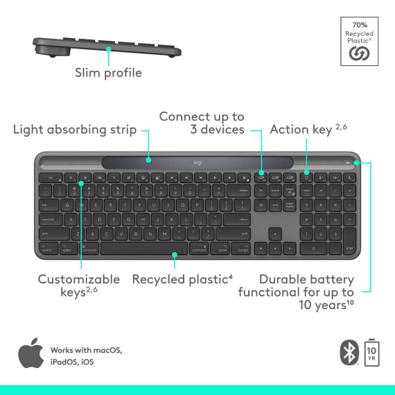 Logitech Signature Slim Solar+ keyboard for Mac solar and artificial light powered durable battery that lasts up to 10 years customizable keys