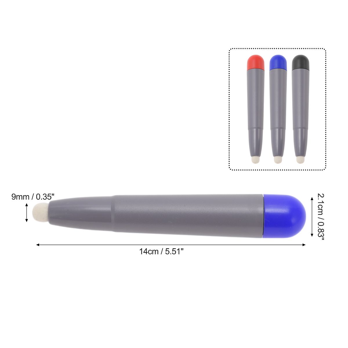 Item Function: 1. This interactive whiteboard pen is crafted from durable ABS and felt material for long-lasting use in classrooms, offices, and presentations, ensuring reliable performance for all interactive needs. 2. This touchscreen pen is ideal for electronic whiteboard presentations, touchscreen interactions, and multimedia classroom settings, offering precise control and functionality for educators and professionals. 3. The compact and light build of these whiteboard pens allows comfortable handling during extended periods, suitable for teaching or presenting without added bulk. 4. Smartboard pens are suitable for various technologies like infrared systems and interactive tablets, ensuring a seamless user experience across different devices. Specifications: Material: ABS, Felt, Pen Tip Diameter: 9mm / 0.35", Size: 14x2.1cm / 5.51"x0.83"(L*D), Package List: 1 Pc Smart Board Pens.