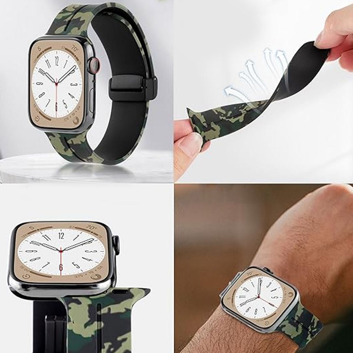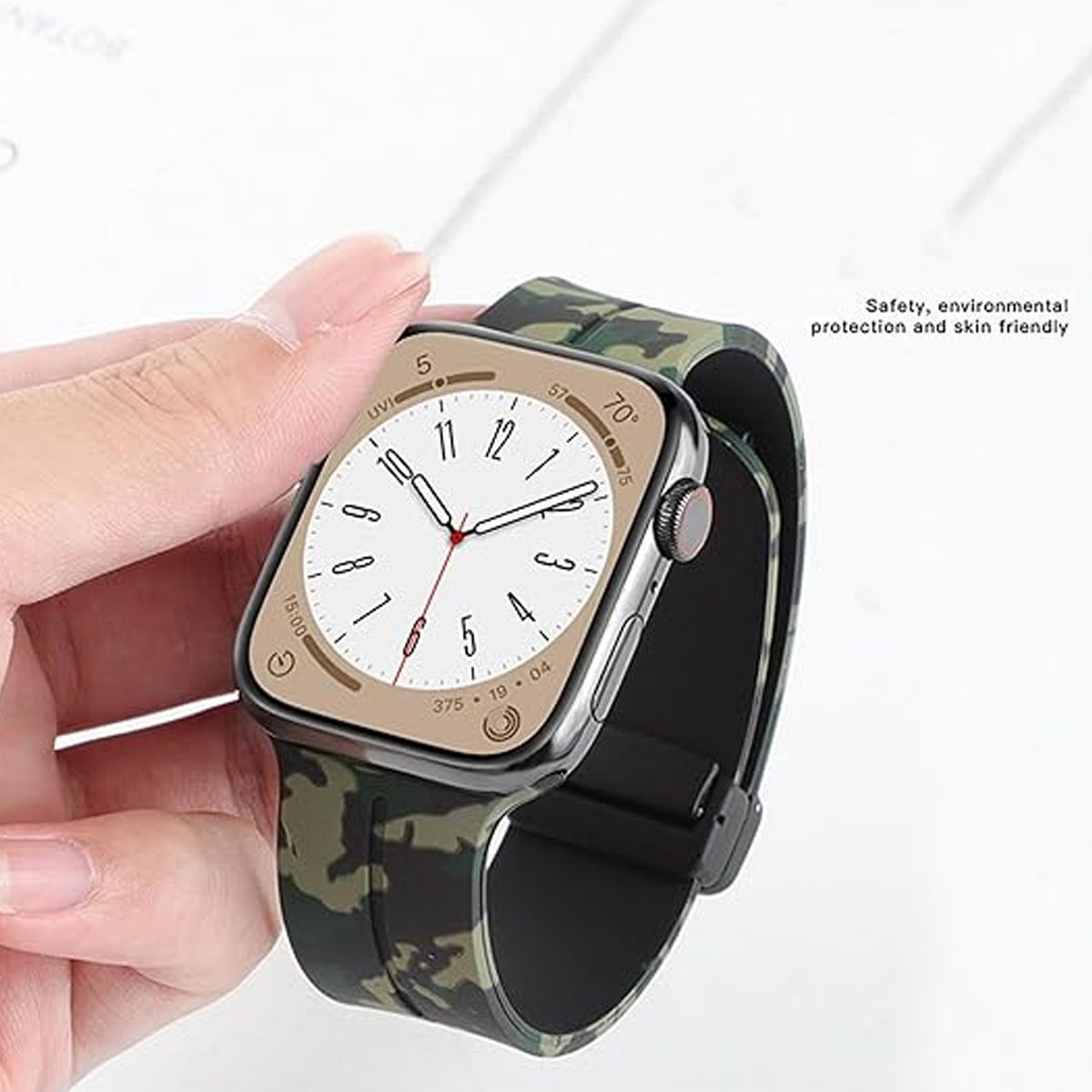 This Apple Watch Band combines trendy camouflage style with reliable sporty functionality, designed specifically for users with iWatch cases who want to add a bold, casual edge to their smartwatch while enjoying all-day comfort. Crafted from high-quality soft silicone, it delivers the flexibility and durability needed for daily wear and active lifestyles—whether you’re hitting the gym, going for a hike, or running errands—while the vibrant camouflage print elevates your look beyond basic solid-color straps.