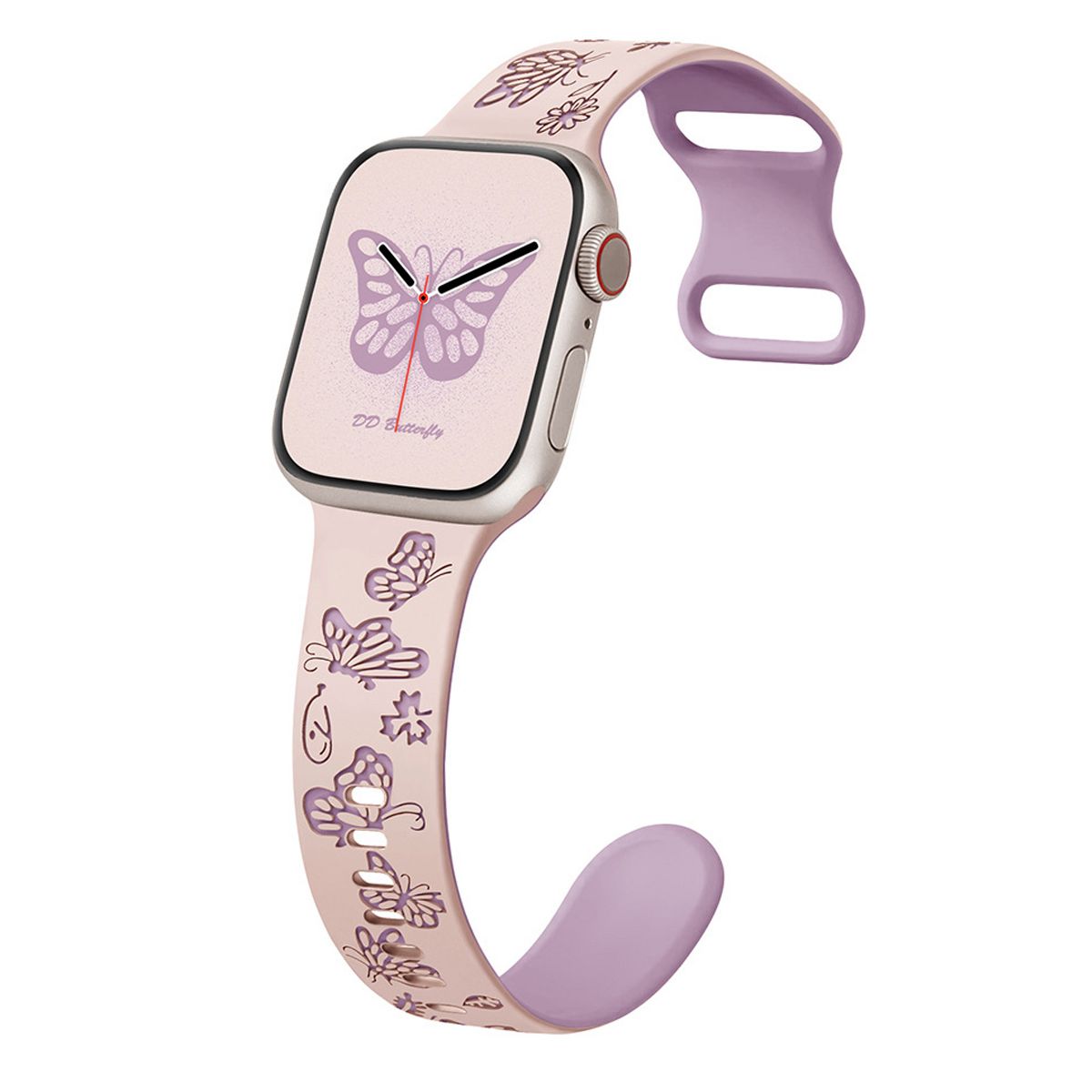 This Butterfly Engraved Apple Watch Band merges whimsical elegance with sporty functionality, featuring intricate butterfly engravings, a eye-catching two-tone silicone design, and a lightweight, flexible structure—tailored exclusively for Apple Watch models, including iWatch Series 10, 9, 8, 7, 6, 5, 4, 3, 2, 1, SE, and Ultra. Designed to elevate smartwatch customization, the strap stands out with its detailed butterfly engravings: precision-carved into the silicone surface, these motifs add subtle texture and a playful, nature-inspired charm, while the two-tone color scheme creates visual depth—avoiding monotony and making the band a statement accessory that complements diverse personal styles.