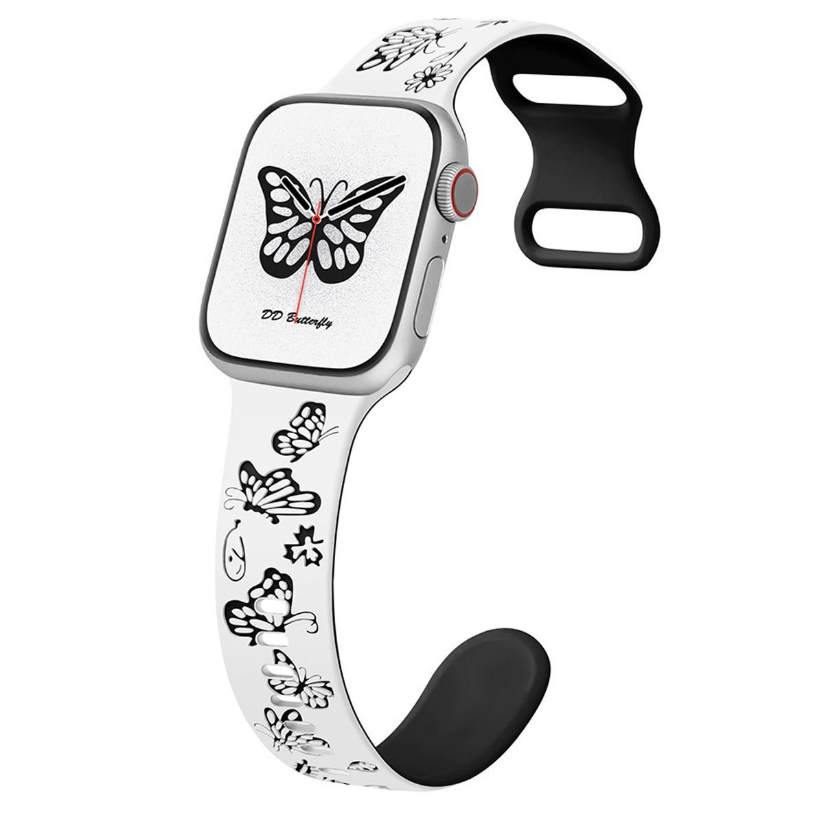 This Butterfly Engraved Apple Watch Band merges whimsical elegance with sporty functionality, featuring intricate butterfly engravings, a eye-catching two-tone silicone design, and a lightweight, flexible structure—tailored exclusively for Apple Watch models, including iWatch Series 10, 9, 8, 7, 6, 5, 4, 3, 2, 1, SE, and Ultra. Designed to elevate smartwatch customization, the strap stands out with its detailed butterfly engravings: precision-carved into the silicone surface, these motifs add subtle texture and a playful, nature-inspired charm, while the two-tone color scheme creates visual depth—avoiding monotony and making the band a statement accessory that complements diverse personal styles.