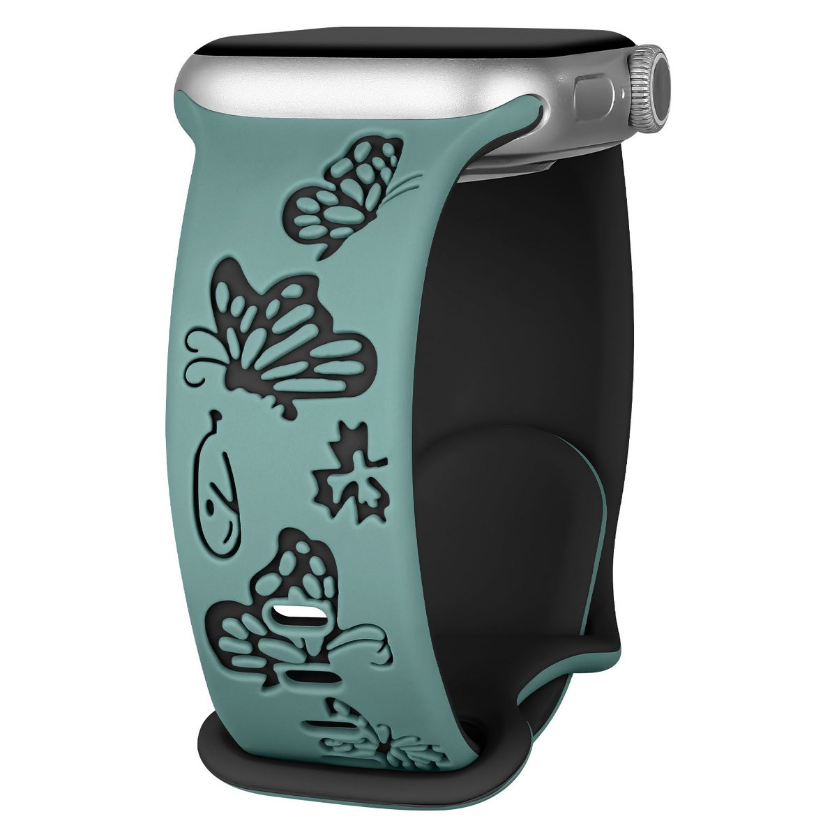 This engraved band for apple watch band features the butterfly engraved two-toned design with two layers of different colors perfect blend. Looks pretty on your wrist. The engraved butterfly design adds a unique and artistic flair to your wrist, making it a perfect accessory for your Apple Watch.