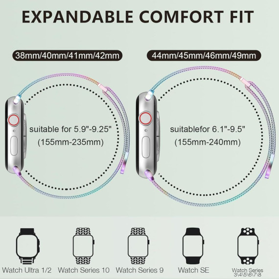 This replacement band, compatible with all Apple Watch Series models, is designed to cater to both women and men, merging style with practicality. Crafted from premium stainless steel, the mesh loop boasts a sleek, interconnected design that offers a comfortable, breathable fit—ideal for all-day wear, whether you’re at work, exercising, or out and about. The magnetic clasp is a standout feature, allowing for effortless adjustment to your wrist size without the need for tools; simply align the magnets for a secure, customized fit. With its versatile aesthetic, this band transitions seamlessly from casual daily activities to more formal occasions, making it a versatile addition to any smartwatch owner’s accessory collection.