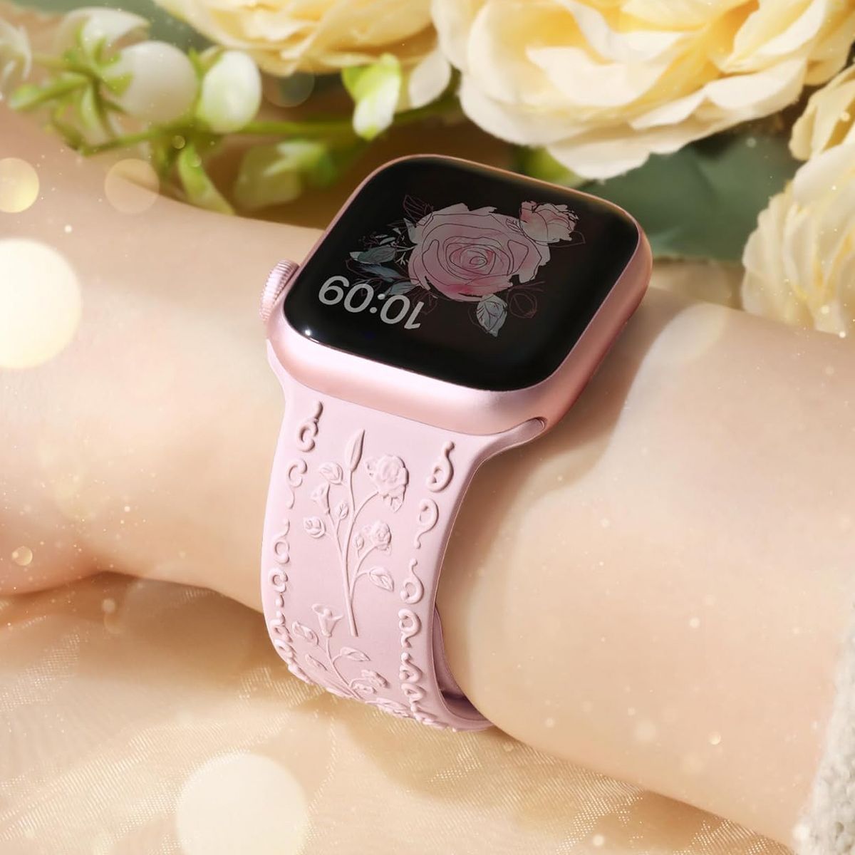HTUTWOO Flower Engraved Apple Watch Band, Embossed Raised Rose Silicone Strap 38/40/41mm for iWatch Series 11 10 9 8 7 6 5 4 3 2 1 SE Ultra (Black)