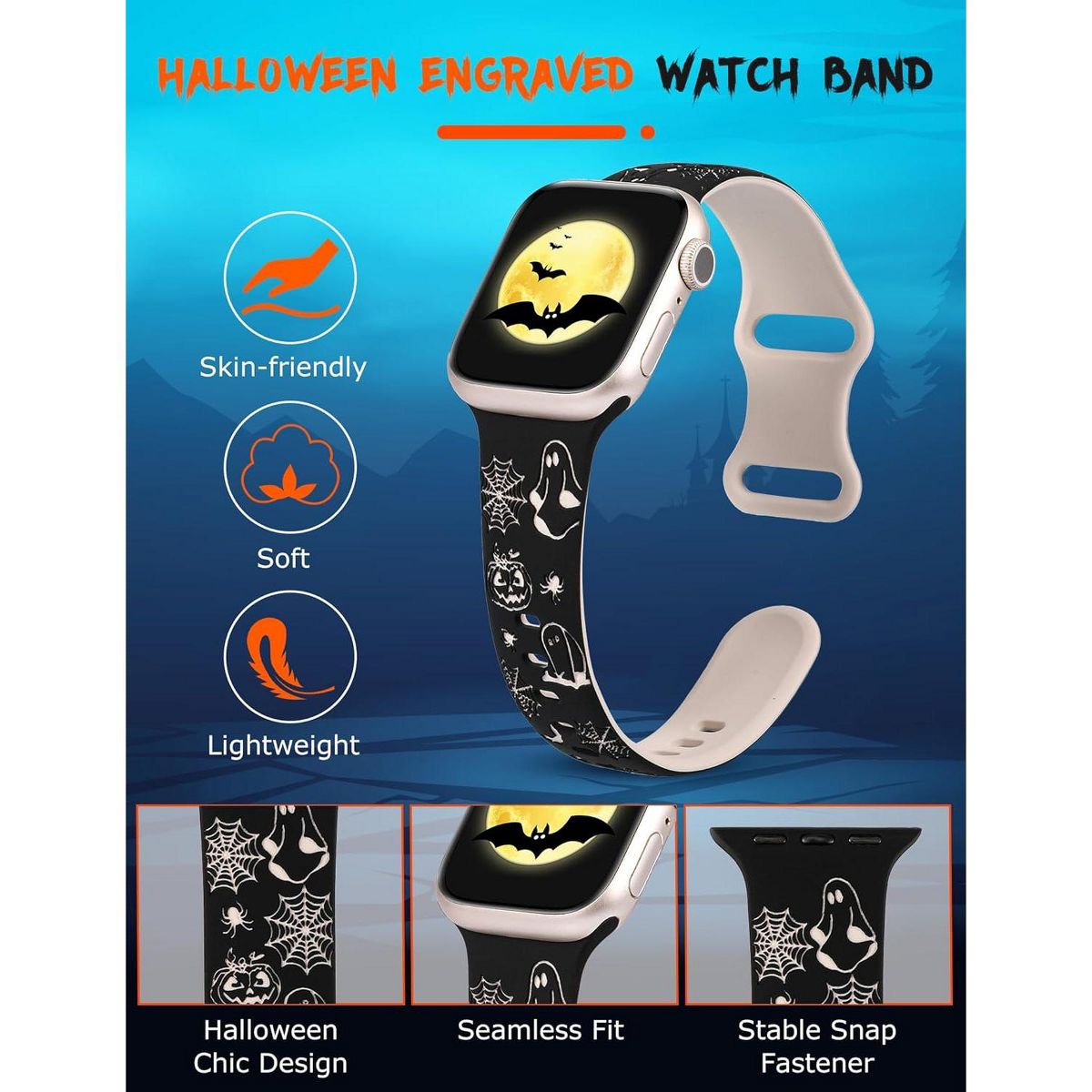This Spooky Halloween iWacth band features the newest Two-Tone design, blending unique festive elements with exquisite design, more vivid, more three-dimensional, and more beautiful, and for a striking visual effect. Making your Watch radiate mysterious charm this Halloween.