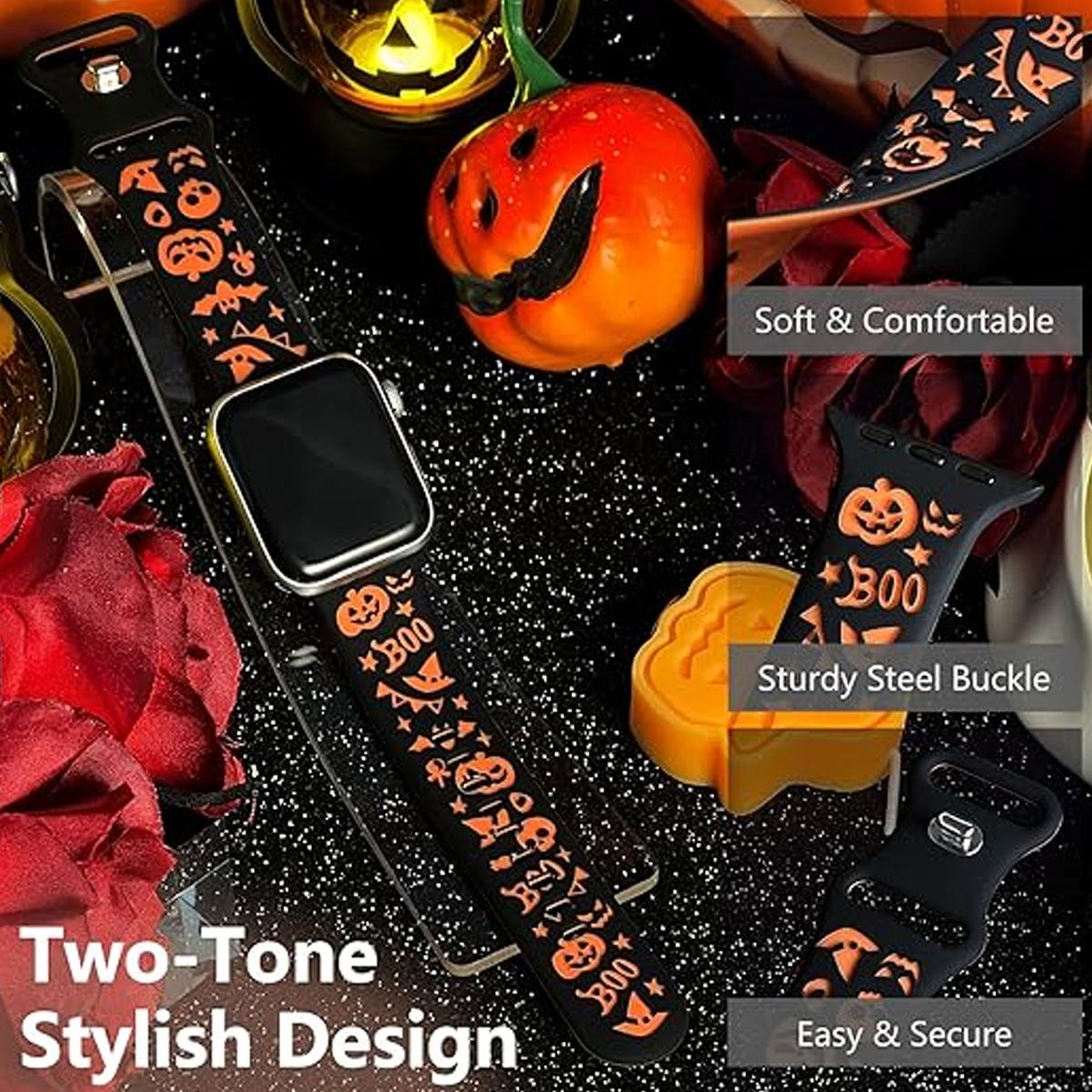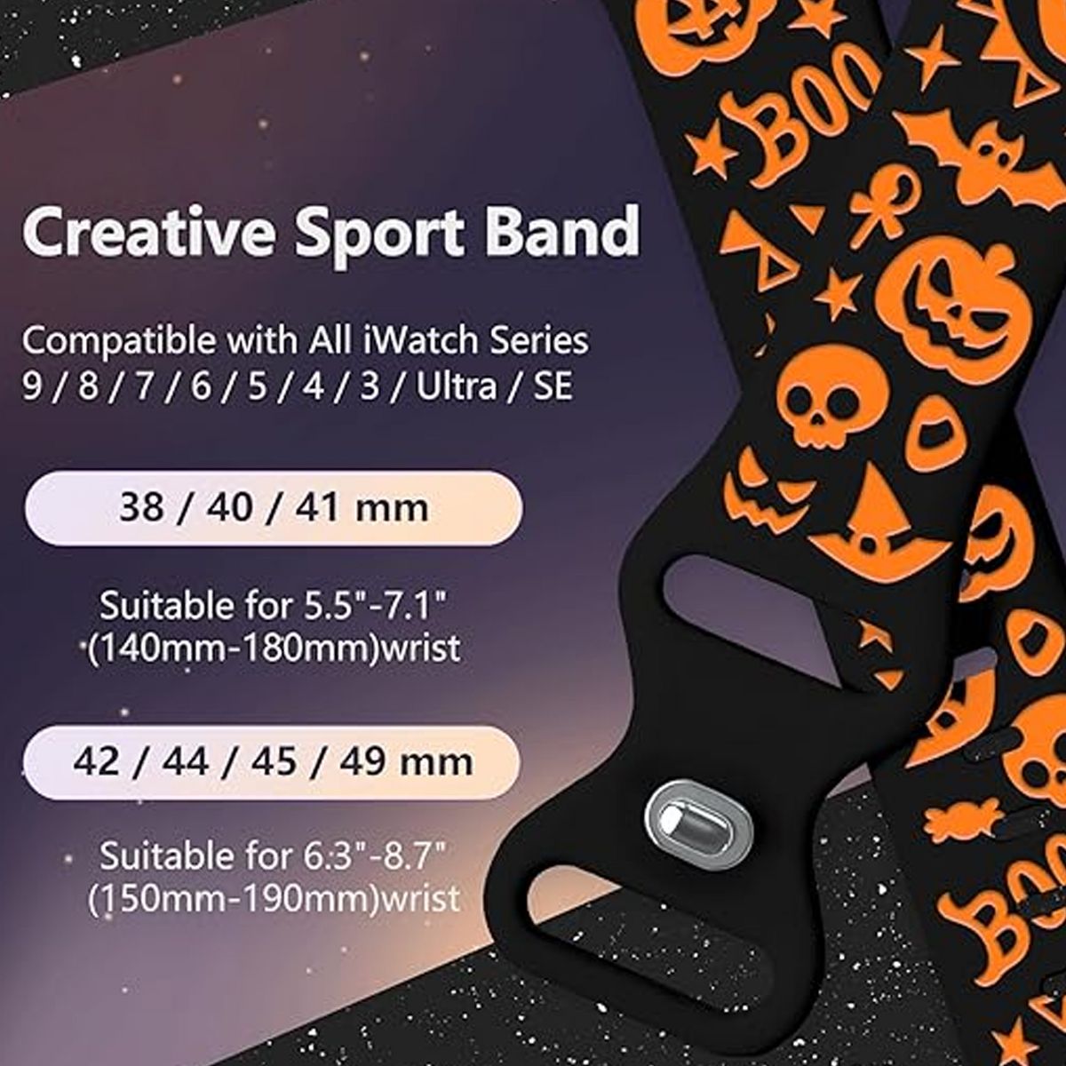 This Halloween Two-Tone Engraved iWatch Band is a festive, eye-catching accessory that infuses your Apple Watch with spooky-sweet holiday charm—perfect for celebrating Halloween or adding a playful seasonal touch to daily wear. Tailored for iWatch cases, it’s fully compatible with a wide range of models: iWatch Series 11, 10, 9, 8, 7, 6, 5, 4, Ultra, and SE, ensuring a seamless fit for most Apple Watch users.