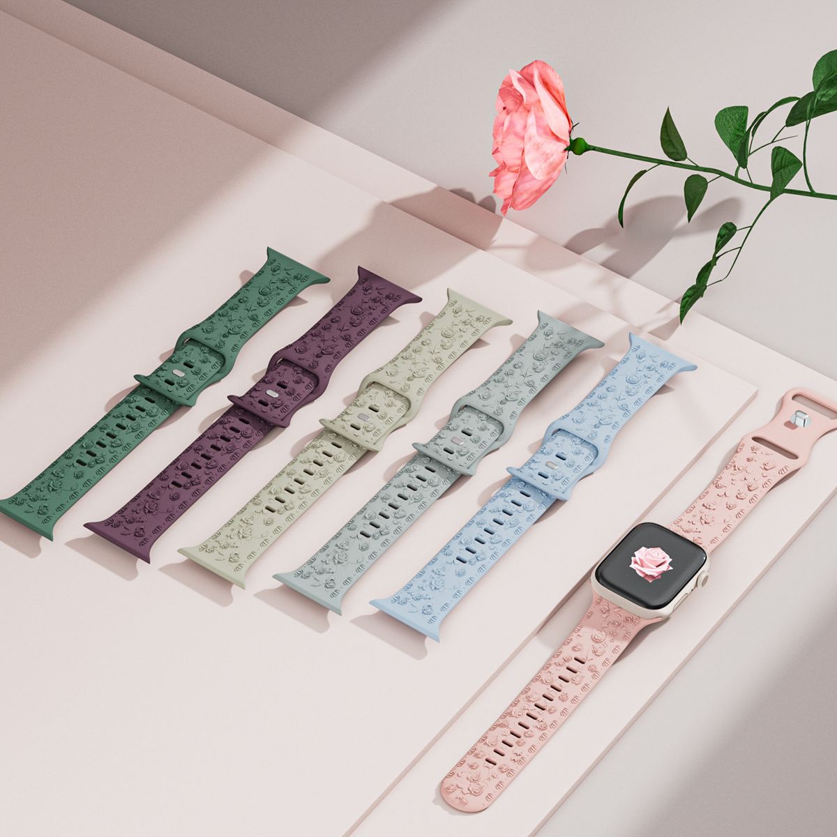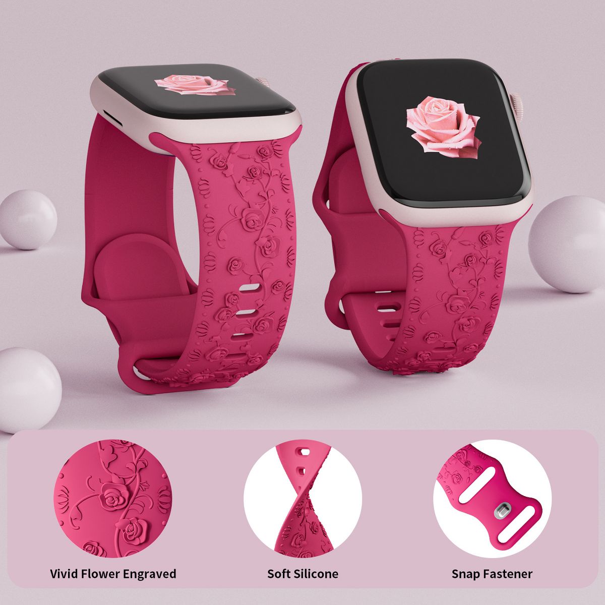 This Rose Engraved Apple Watch Band combines elegant floral design with sporty comfort, featuring intricate rose engravings, delicate rose floral patterns, and a soft sport silicone material—perfectly tailored for Apple Watch models, including iWatch Series 11, 10, 9, 8, 7, 6, 5, 4, 3, 2, 1, SE, and Ultra. Crafted to blend style and functionality, the strap redefines Apple Watch customization: the surface of the silicone band is adorned with precision-engraved rose motifs that add a subtle, sophisticated texture, while hand-painted or printed rose floral accents elevate its visual appeal—avoiding overly bold designs and instead offering a timeless, feminine touch that complements both casual and semi-formal outfits.