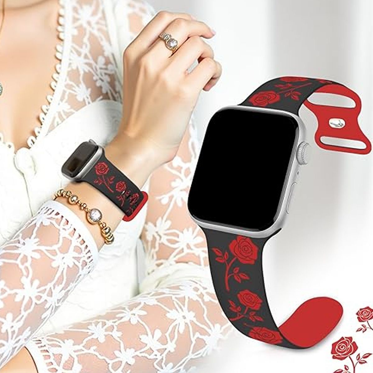 This Rose Floral Engraved Apple Watch Band combines elegant design with everyday comfort, featuring intricate rose floral engravings, a soft two-tone silicone construction that fits Apple Watch Series 11, 10, 9, 8, 7, 6, 5, 4, 3, 2, 1, SE, and Ultra models. Unlike plain silicone straps that lack personality or rigid engraved bands that feel uncomfortable, this watch band solves two key pain points for Apple Watch users: it adds a feminine, decorative touch via delicate rose floral engravings while retaining the flexibility and breathability of silicone for all-day wear; and its two-tone color scheme complements both casual and semi-formal outfits, making it versatile for work, workouts, or weekend outings.