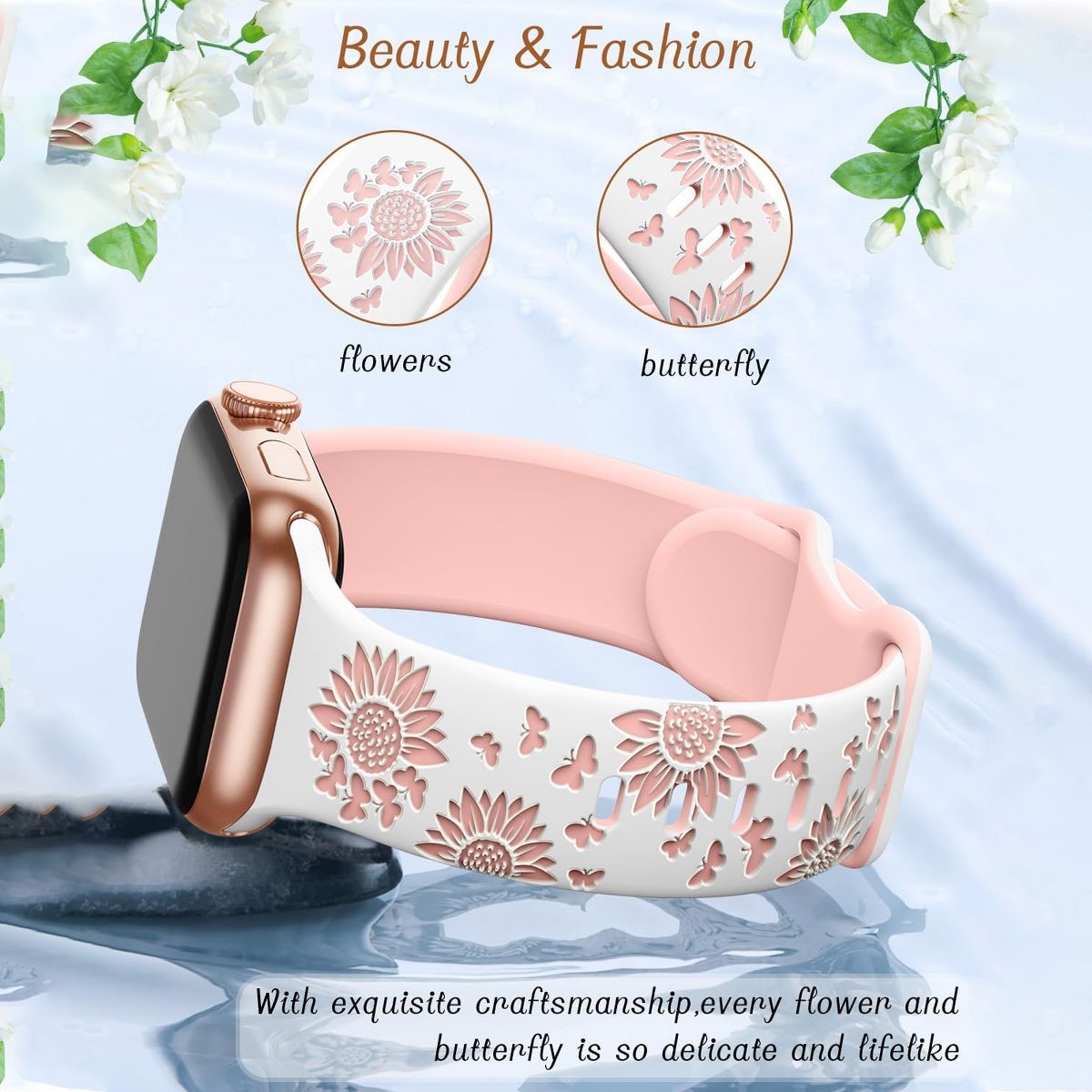 HTUTWOO Sunflowers Engraved Apple Watch Band, Soft Silicone Sport Strap 38/40/41mm for iWatch Series 11 10 9 8 7 6 5 4 3 2 1 SE Ultra (White+Pink)
