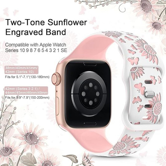 HTUTWOO Sunflowers Engraved Apple Watch Band, Soft Silicone Sport Strap 38/40/41mm for iWatch Series 11 10 9 8 7 6 5 4 3 2 1 SE Ultra (White+Pink)