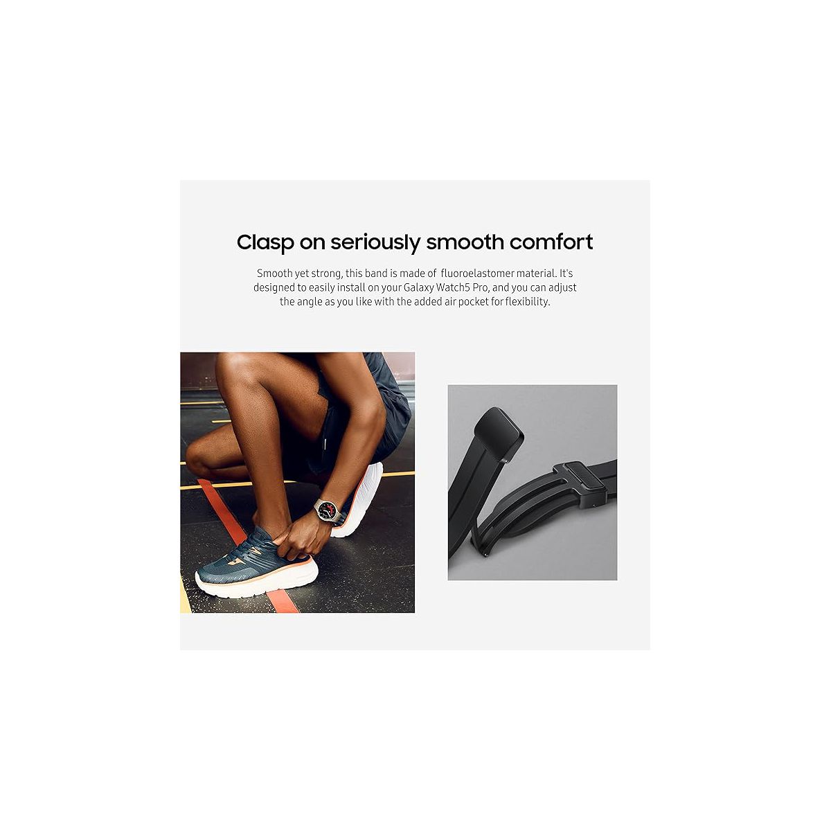 Smooth yet strong, this band is made of fluoroelastomer material. It's designed to easily install on your Galaxy Watch5 Pro, and you can adjust the angle as you like with the added air pocket for flexibility.