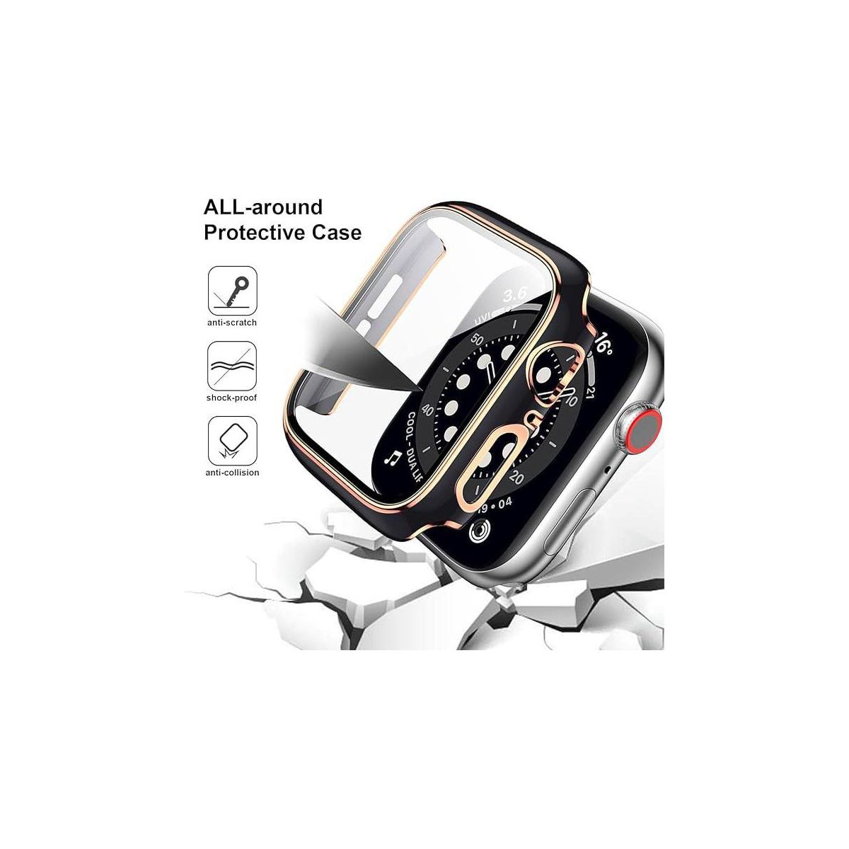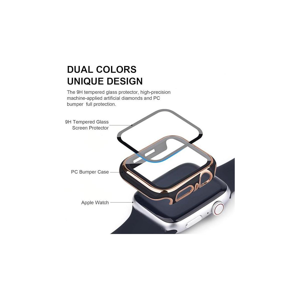 Worryfree Gadgets Bumper Case with Screen Protector for Apple Watch 45mm, Black/Gold - 45MM