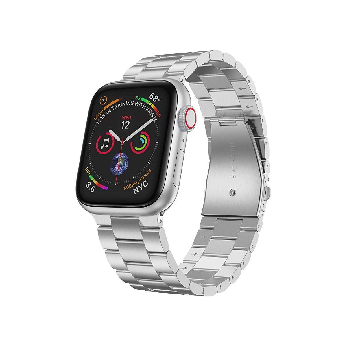 The band is made from upgrade satin-brushed stainless steel material with secure folding buckle, crafted from superb polishing and electroplating process with advanced workmanship, the masculine, strong, flowing lines and the glossy finish with sharp aesthetic gives its appearance a harmonious visual unity. Secure Folding Buckle for Apple Watch band replacement adopts refined double buttons folding clasp design, double firmly closed to avoid your Apple watch loose automatically and fall down by accident. You only need to press the release buttons on both sides of the buckle to open the watch straps simply.