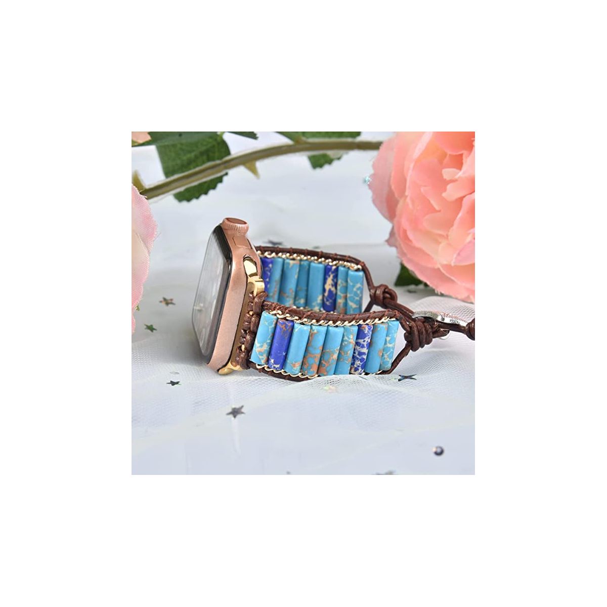 Unique Style Adjustable, high quality natural stone beaded pearls slowly polished by the experienced artificers. Concise stylish, smooth, comfortable, beautiful colors, feminine and elegant looking. Versatile and Stylish: This unique watch strap has turquoise stones but also exceptional details that will make a superb fashion statement and valuable addition to your jewelry collection! Use Occasions Classy and elegant iwatch band makes it a sleek and robust daily companion, perfect for decorating smartwatch bands all over again. Perfect Gifts If you choose this handmade beaded band for your mother/daughter/wife/best friends as a gift, they will be surprise how cute it is Compatibility: 38, 40 & 41mm Apple Watch Specifications Finish: Blue Weight: 0.25 lbs