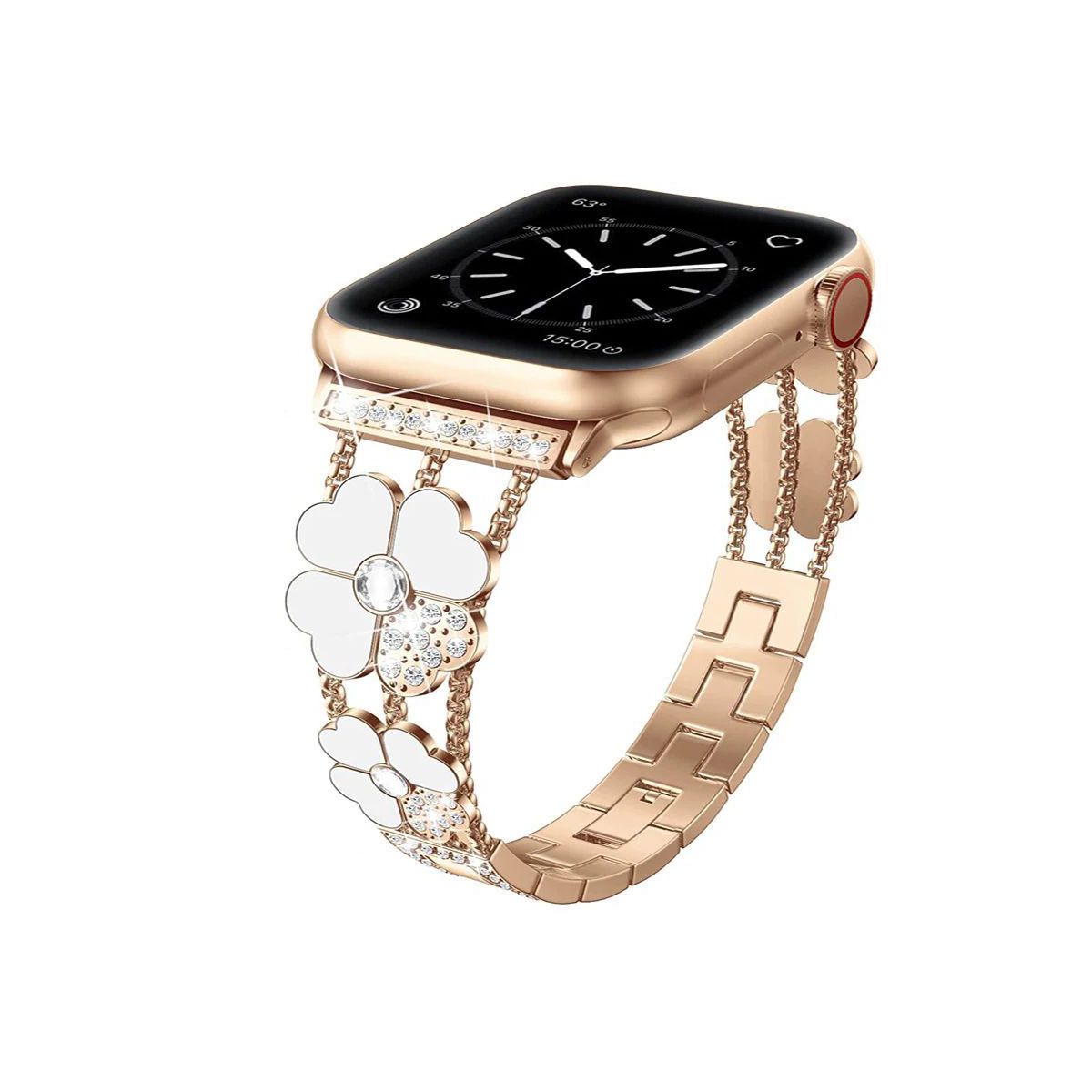 Worryfree Gadgets Metal Band for Apple Watch Clover Design 42/44/45mm, White Flower/Rose Gold