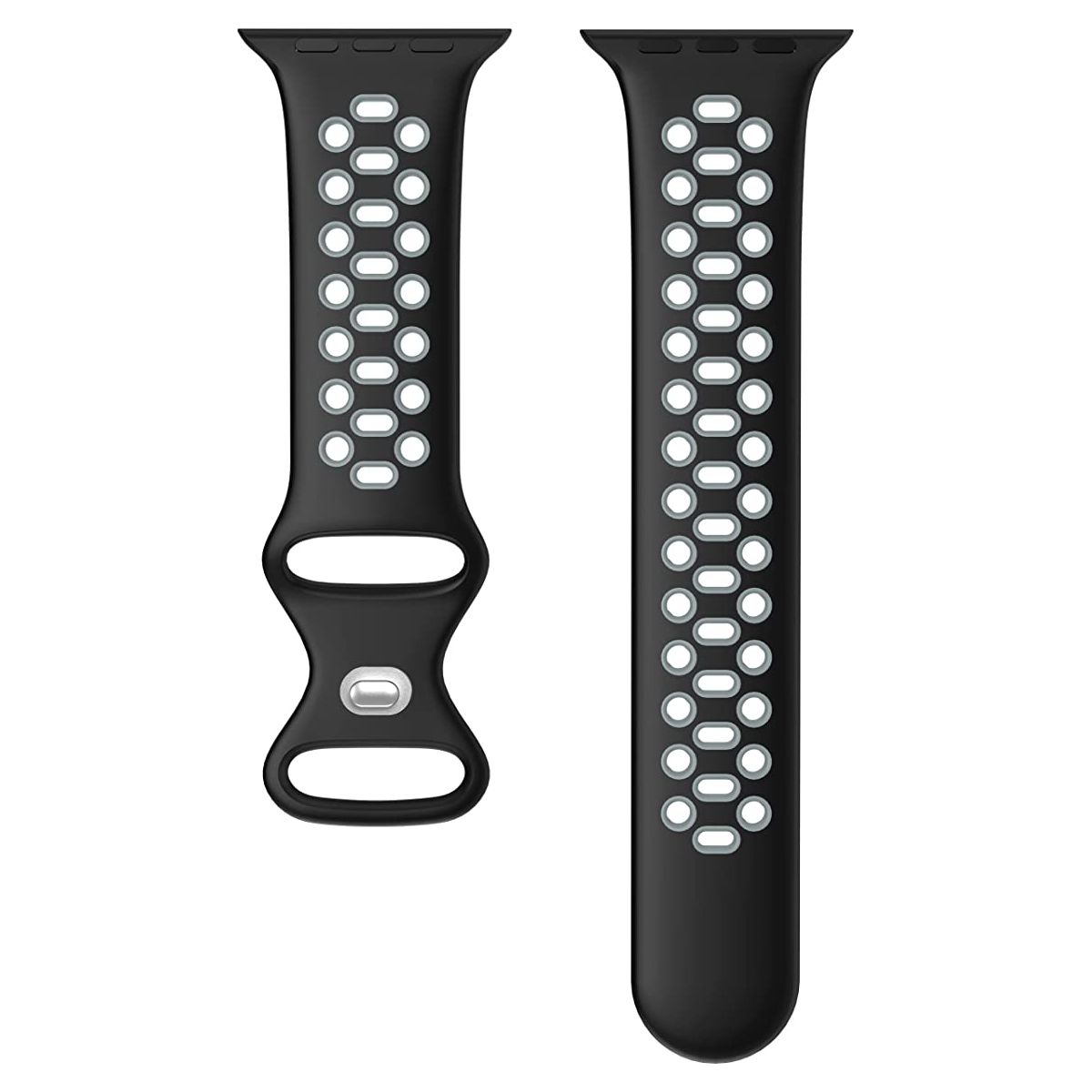 Worryfree Gadgets Dual Color Silicone Band For Apple Watch 42/44/45mm- Black/Gray Soft Silicone material Dual Color breathable sports band. Apple Watch Size : 42mm 44mm 45mm Compatible Series: Series 8, Series 7, Series 6, Series 5, Series 4, Series 3, Series 2, Series 1 and Series SE