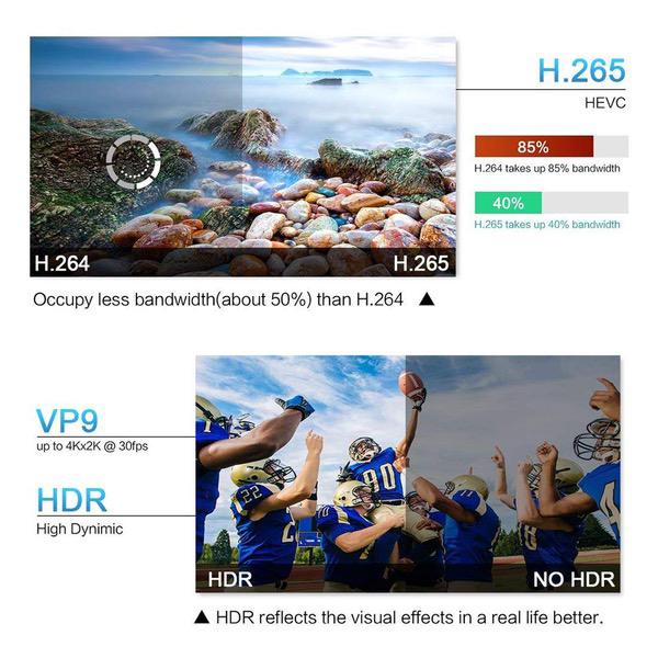 - H.265 Hardware Video Decode and 4k 2k Full HD Output, low latency, low bit rate, low bandwidth, high resolution, connect to the internet more faster and get higher quality picture