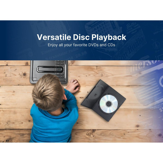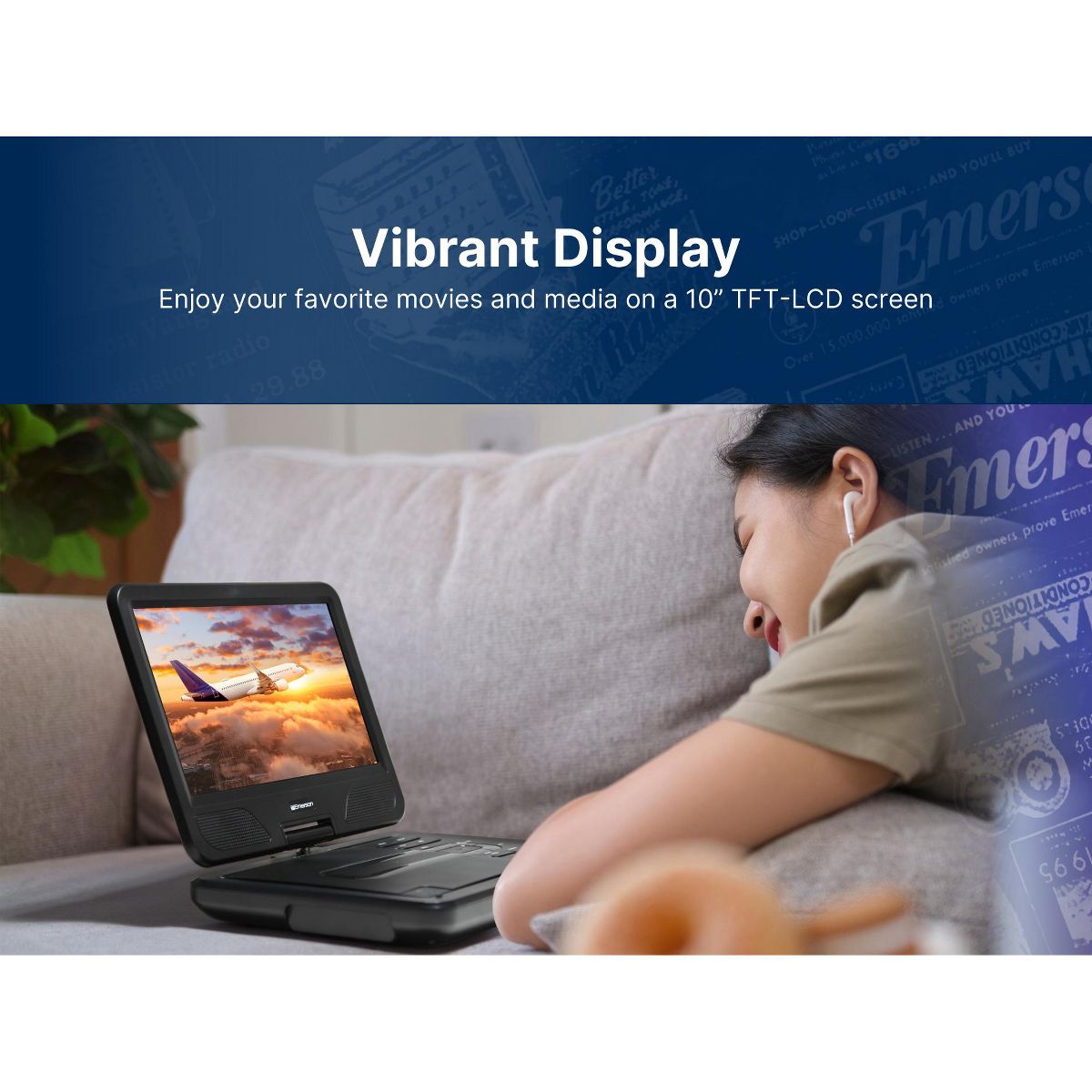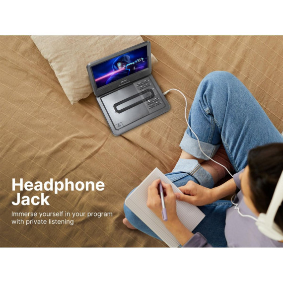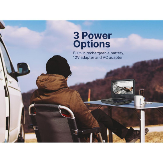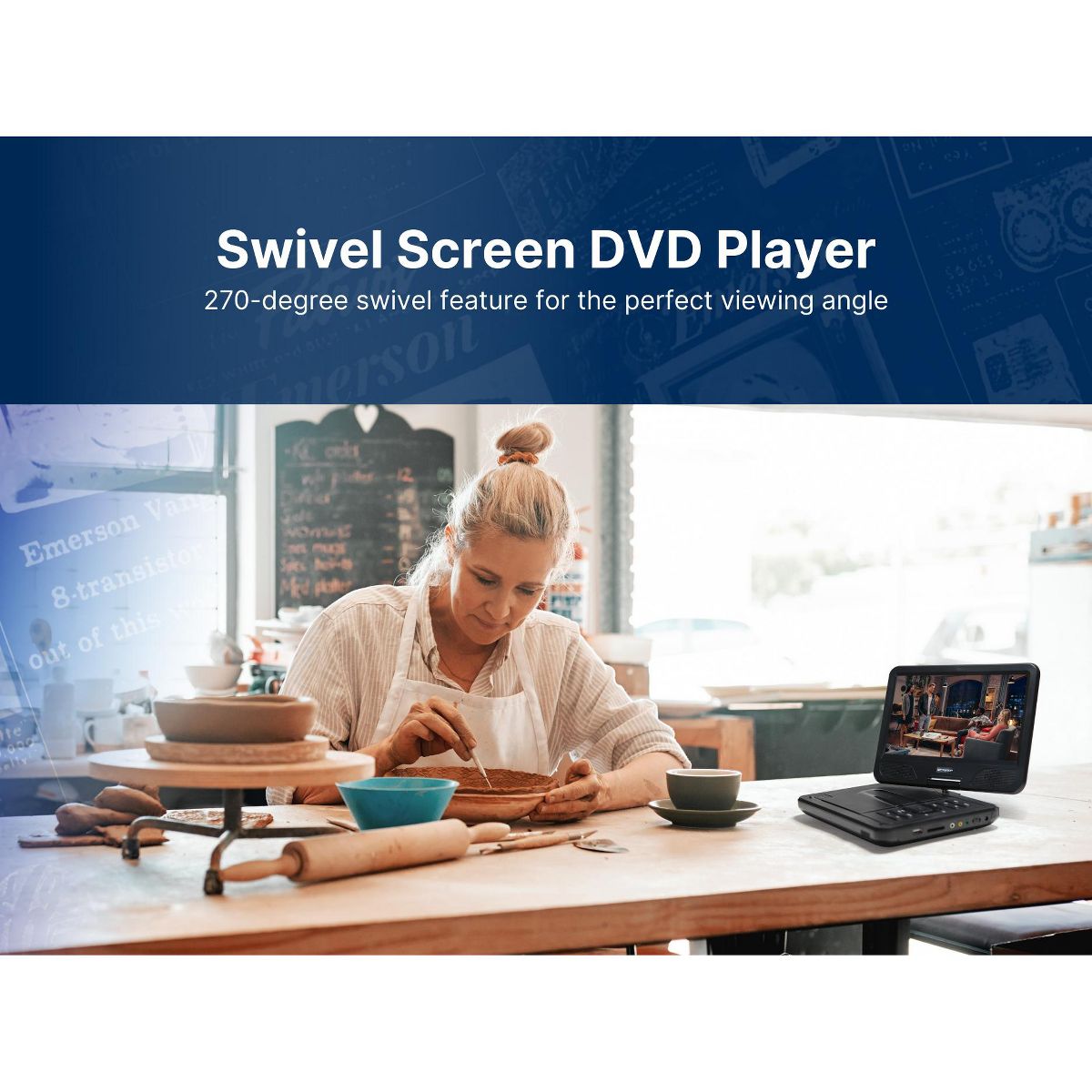 The Emerson 10'’ TFT Swivel Screen DVD Player provides virtual entertainment wherever you go, whether waiting or traveling. Movies are shown on a 10-inch LCD screen, swiveling to 180 degrees to provide the best view. This DVD player reads media from SD and MMC cards with a built-in reader and files from USB flash drives. Built-in speakers project powerful audio, while the headphone jack lets you listen in privacy. An AC adapter, a built-in battery, or a Dc 12V cord for venices power this device This LCD DVD player also includes a full- function remote, making controlling the unit more convenient.