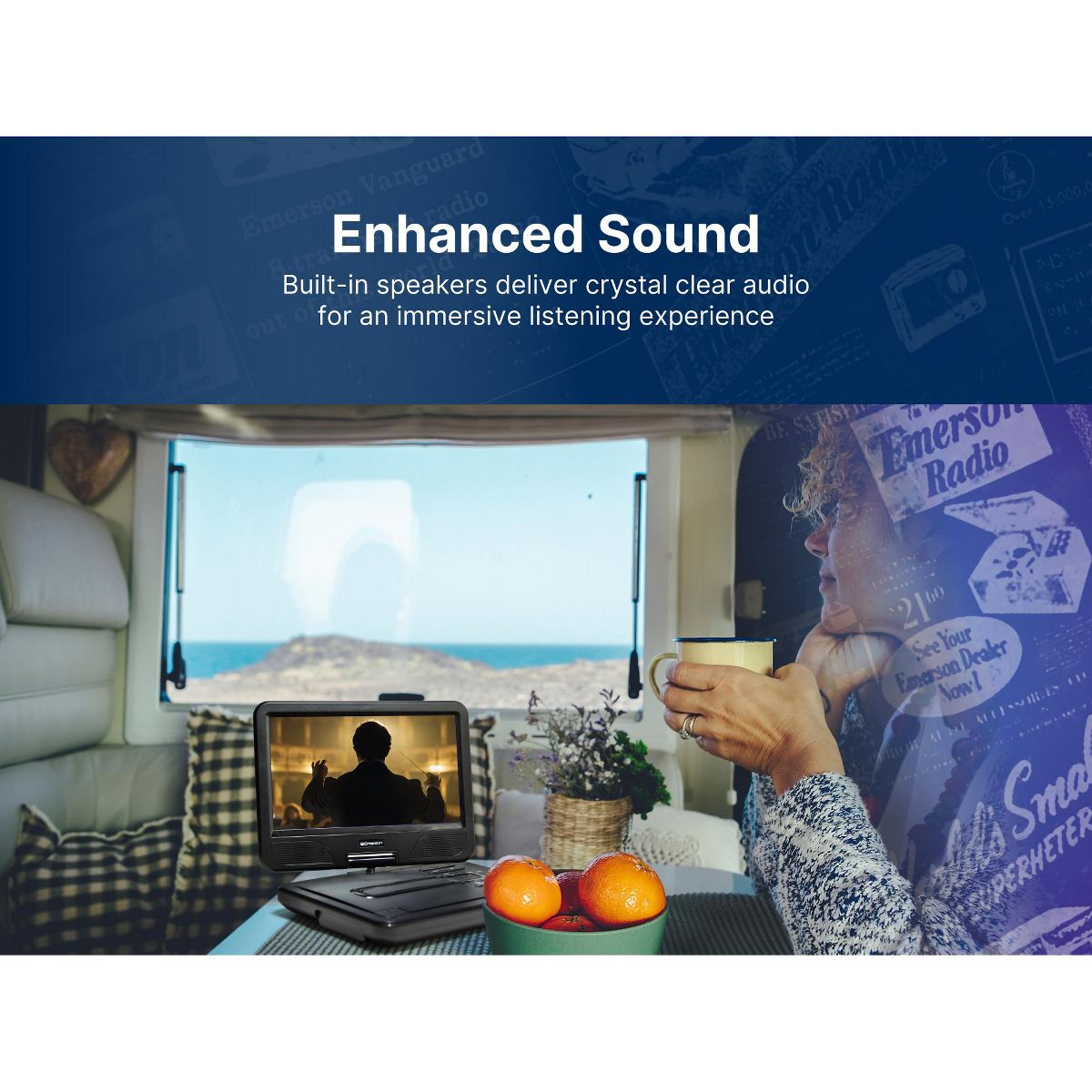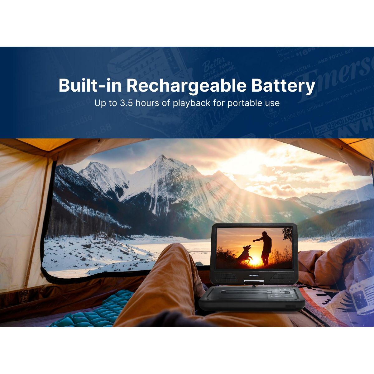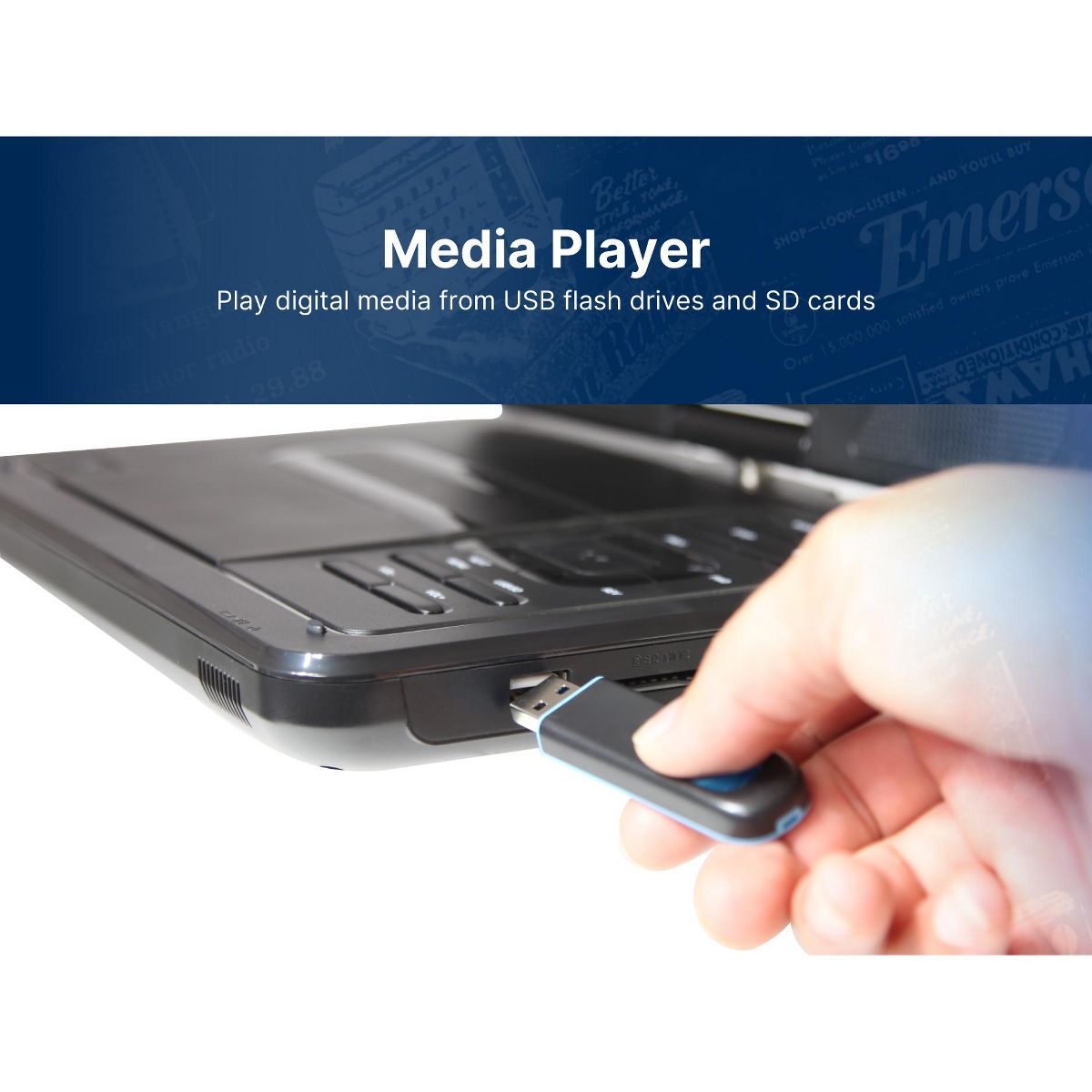 The Emerson 10'’ TFT Swivel Screen DVD Player provides virtual entertainment wherever you go, whether waiting or traveling. Movies are shown on a 10-inch LCD screen, swiveling to 180 degrees to provide the best view. This DVD player reads media from SD and MMC cards with a built-in reader and files from USB flash drives. Built-in speakers project powerful audio, while the headphone jack lets you listen in privacy. An AC adapter, a built-in battery, or a Dc 12V cord for venices power this device This LCD DVD player also includes a full- function remote, making controlling the unit more convenient.