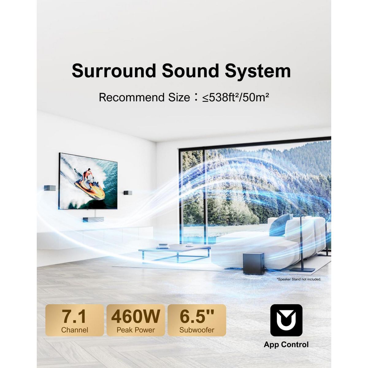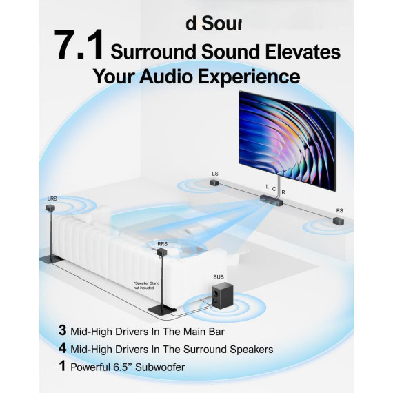 Upgrade your home entertainment with this advanced sound bar. It features a 7.1Ch smart surround sound system with eight high - performance drivers, including a 6.5” wireless subwoofer. The Dolby Atmos technology dynamically adapts audio, creating a 360° sound environment. With two innovative audio technologies, it projects sound from every angle. The 1 - in/1 - out 4K HDMI with eARC simplifies setup and ensures compatibility with various devices. Use the smart app for full control, OTA updates, and customizable settings. It also offers 121 expert EQ presets and multiple tailored modes for precision audio tuning. Whether you're watching movies, TV shows, or playing games, this sound bar provides an immersive audio experience, making it a must - have for your home theater.