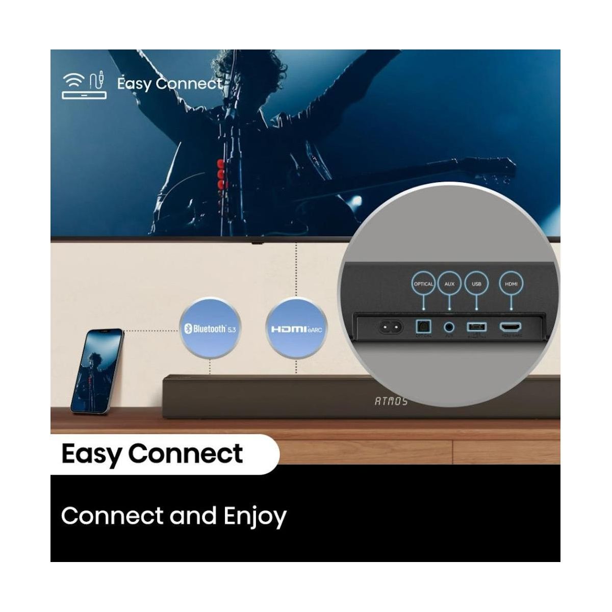 Upgrade your audio experience with the Hisense R632 3.1 channel soundbar and wireless subwoofer. The R632’s 380 watts of sound fills the room with a 5-speaker array that also projects sound overhead, making the most of Dolby Atmos for an immersive surround sound experience. With 7 audio enhancement modes—including news, movie, sports, game, and night—you can optimize sound specifically to the content or time of day. And eARC provides a simple one-cable connection with the included HDMI cable. Plus, Bluetooth audio makes it easy to connect your phone, tablet, or laptop wirelessly to enjoy music and more.