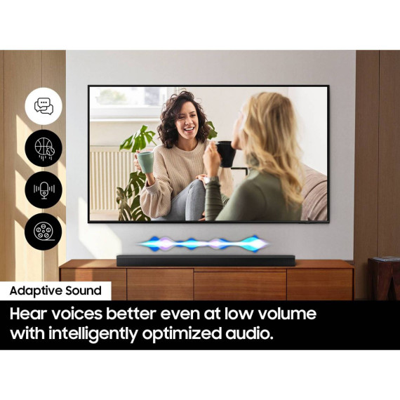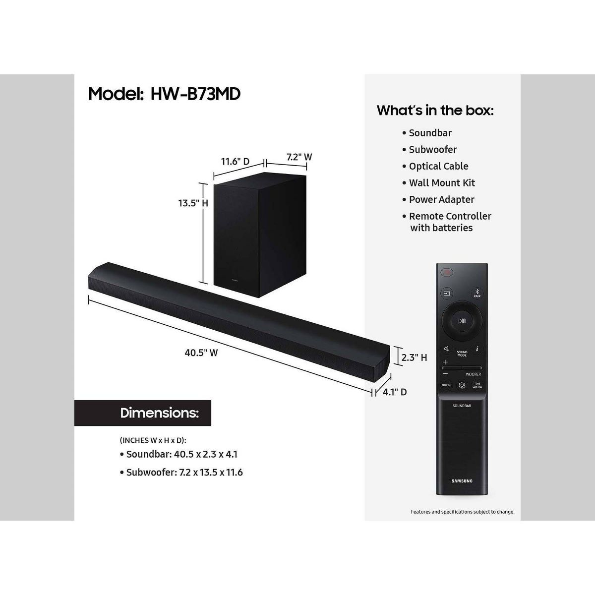 A multi-channel soundbar that brings you enhanced audio through built-in center and side speakers with a wireless subwoofer included. The B73MD actively adapts to on screen content, optimizing sound scene by scene. Voice Enhance Mode optimizes the equalizer to maximize voice clarity. Optimize your gaming experience with perfectly synced directional audio of Game Mode.