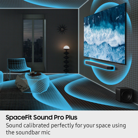 SpaceFit Sound Pro PlusEnjoy stunning sound automatically calibrated to your room using sensors embedded into the soundbar. It analyzes your space and adjusts the audio - even optimizing bass - for clear sound and immersion.