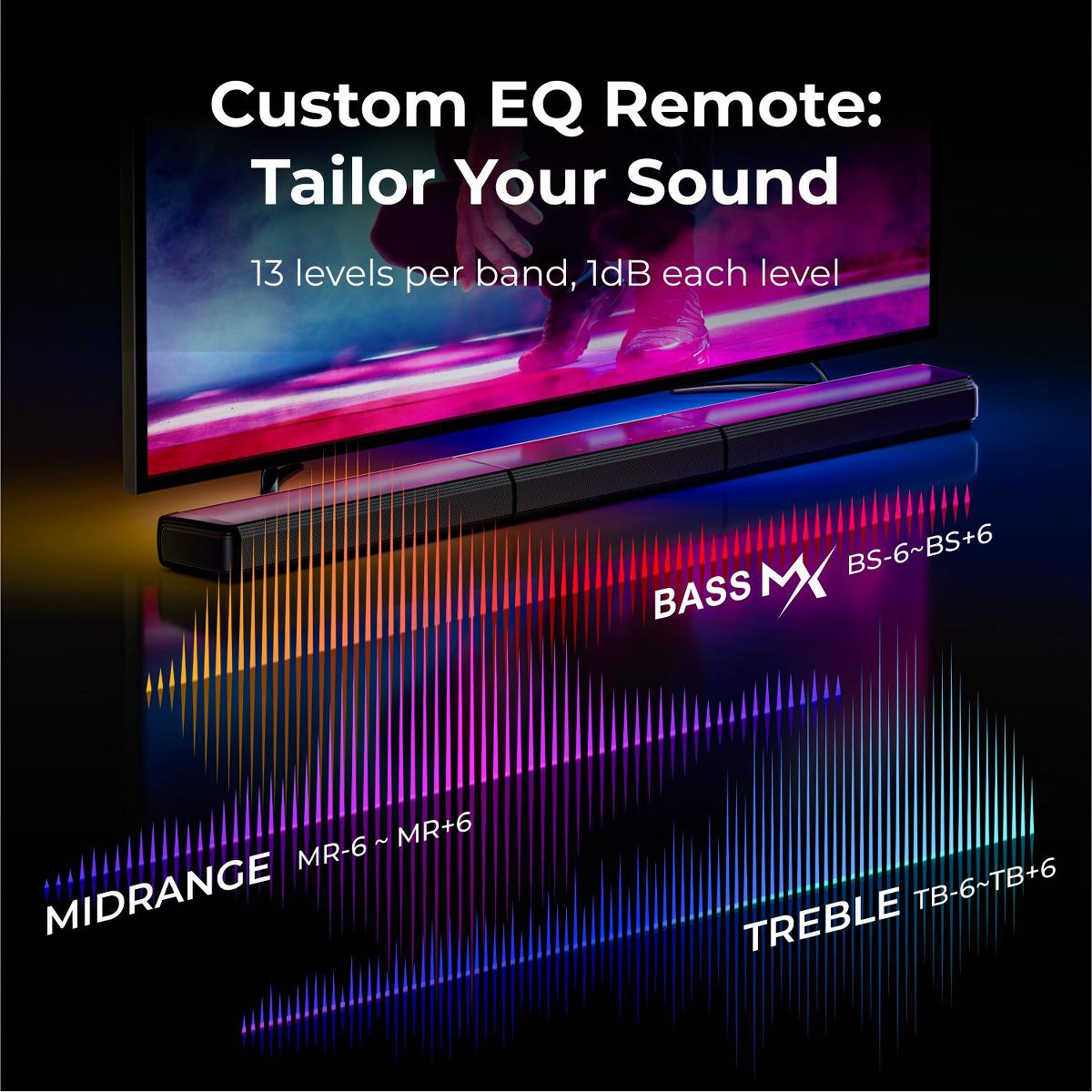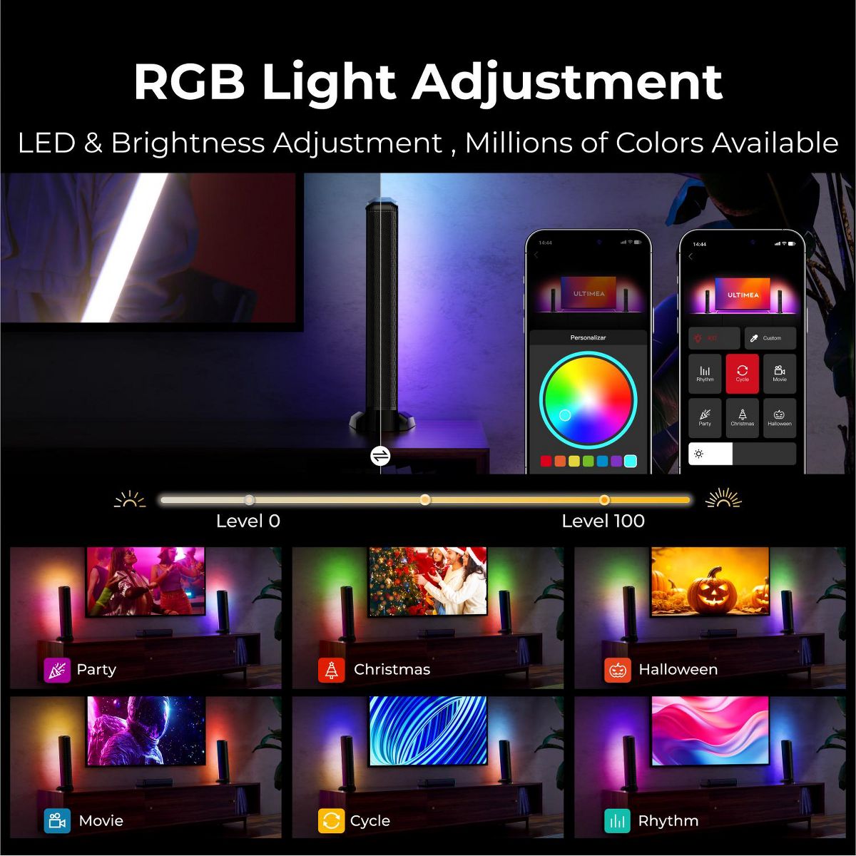 Step into immersive audio with the ULTIMEA 7.1 Channel Virtual Surround, complete with dual rear speakers and a powerful 6.5" subwoofer. Designed for smart TVs, it delivers a wide, multi-directional soundstage that transforms everyday viewing into cinematic experiences. With 410W of peak power and customizable RGB lighting, this system enhances both sound and atmosphere. Whether you're gaming or enjoying a movie night, the vibrant backlighting adds an extra dimension of immersion, reacting to every beat and scene. The modular, detachable design adapts to any room layout, while Bluetooth, HDMI, OPT, and AUX ensure effortless connections. Fine-tune EQ, lighting, and sound modes with the ULTIMEA app-personalized control for next-level entertainment.