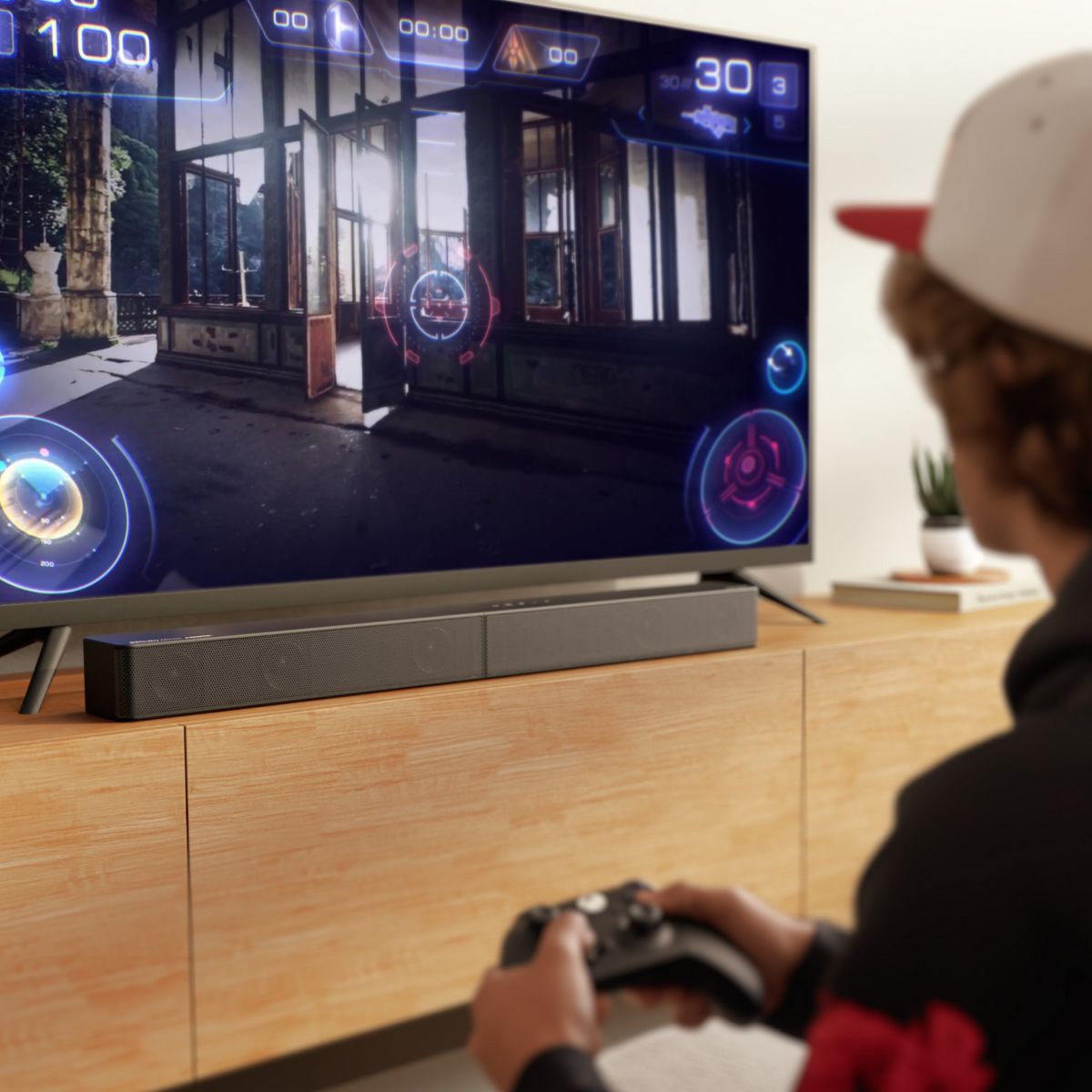 Enjoy immersive 4D sound with real Dolby Atmos and 5.1-channel audio. Featuring five precision-tuned full-range drivers and a dedicated wired wooden subwoofer, the system delivers up to 340W of peak power for bold, room-filling sound. With a frequency response of 45 Hz–18 kHz and a maximum SPL of 99 dB, it reproduces everything from subtle nuances to explosive cinematic effects. Powered by BassMX technology, the wired wooden subwoofer features a 18 mm high-excursion driver, a upgraded cabinet, and a high-density magnetic circuit. This design delivers deeper, tighter bass with greater air displacement and enhanced low-frequency performance-bringing more realism to every scene.