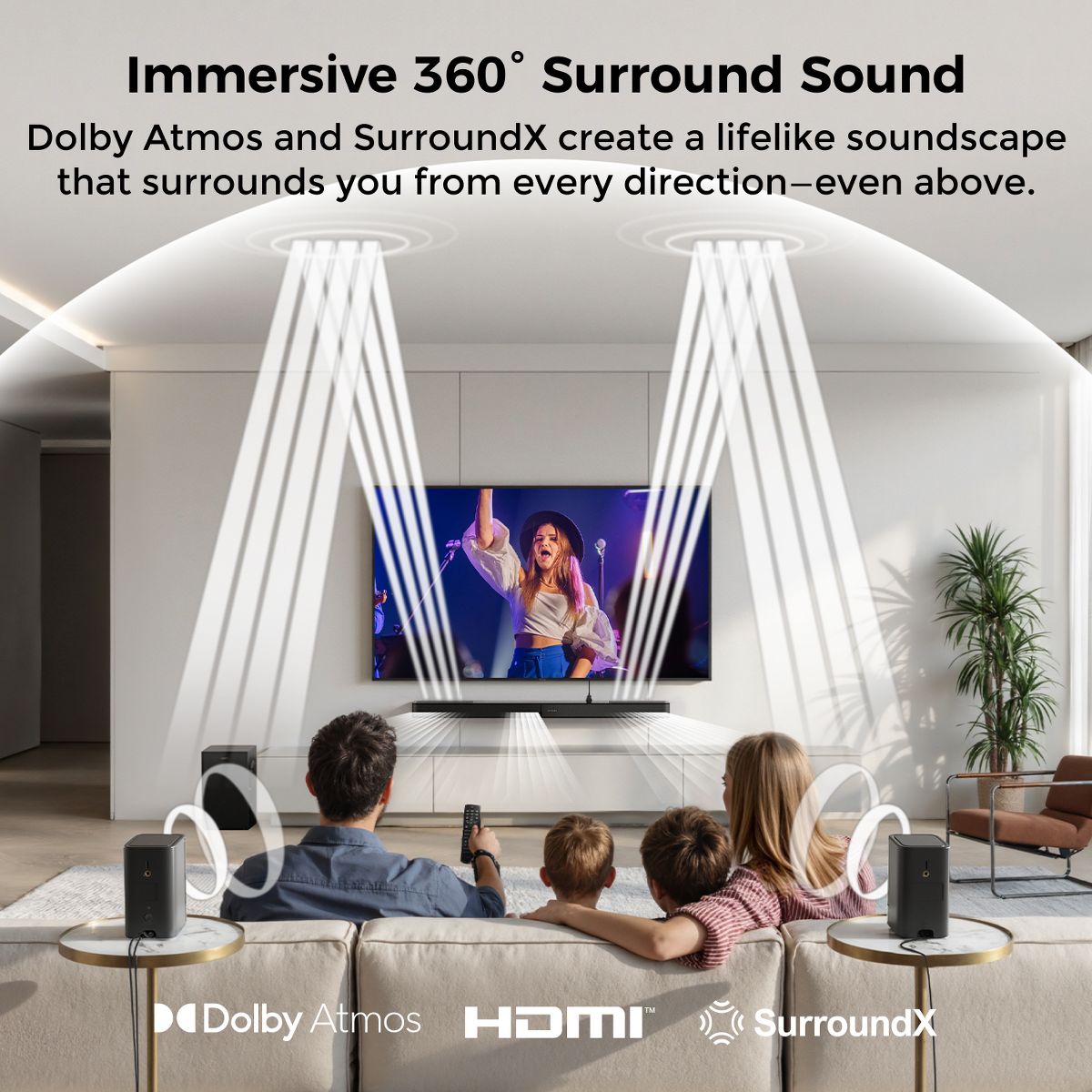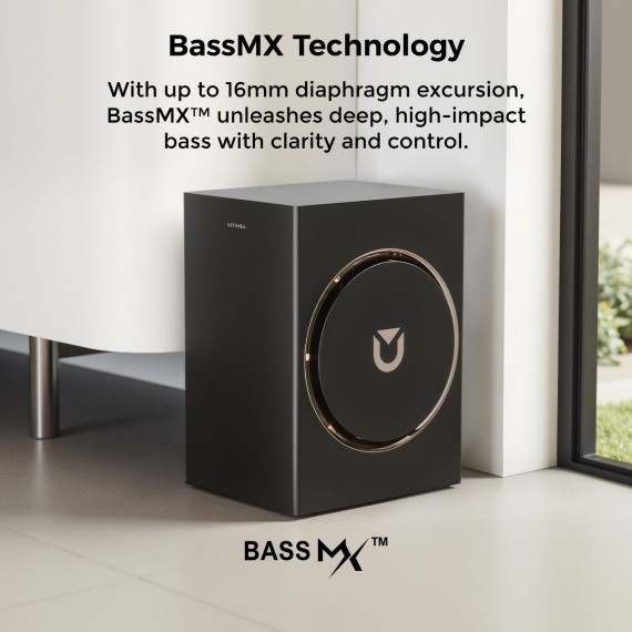 The ULTIMEA Skywave F40 Boom 5.1.2 Channel Soundbar with Dolby Atmos delivers an immersive home theater experience with up-firing drivers, dual surround speakers, and a powerful subwoofer. SurroundX 360° Audio creates a realistic 3D sound field, while BassMX technology delivers deep, precise bass down to 40Hz. HDMI eARC ensures lossless audio transmission, and the Ultimea App allows full control with a 10-band EQ, level adjustment, and OTA updates. With Bluetooth 5.4 for stable, low-latency streaming, it's perfect for movies, music, and gaming.