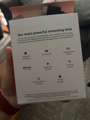Our most powerful 4K streaming stick. Level up your 4K Ultra HD entertainment with a powerful 2.0 GHz quad-core processor for lightning-fast app starts, next-gen Wi-Fi 6E support for smoother streaming, and double the storage for even more downloads. Choose from over 1.5 million movies and TV episodes and control it all with the press of a button. Plus, Fire TV Ambient Experience brings atmosphere to any room. In the Box: Fire TV Stick 4K Max, Alexa Voice Remote Enhanced, power cable and power adapter, HDMI extender cable for Fire TV Stick 4K Max (2nd Gen), 2 AAA batteries, Quick Start Guide.