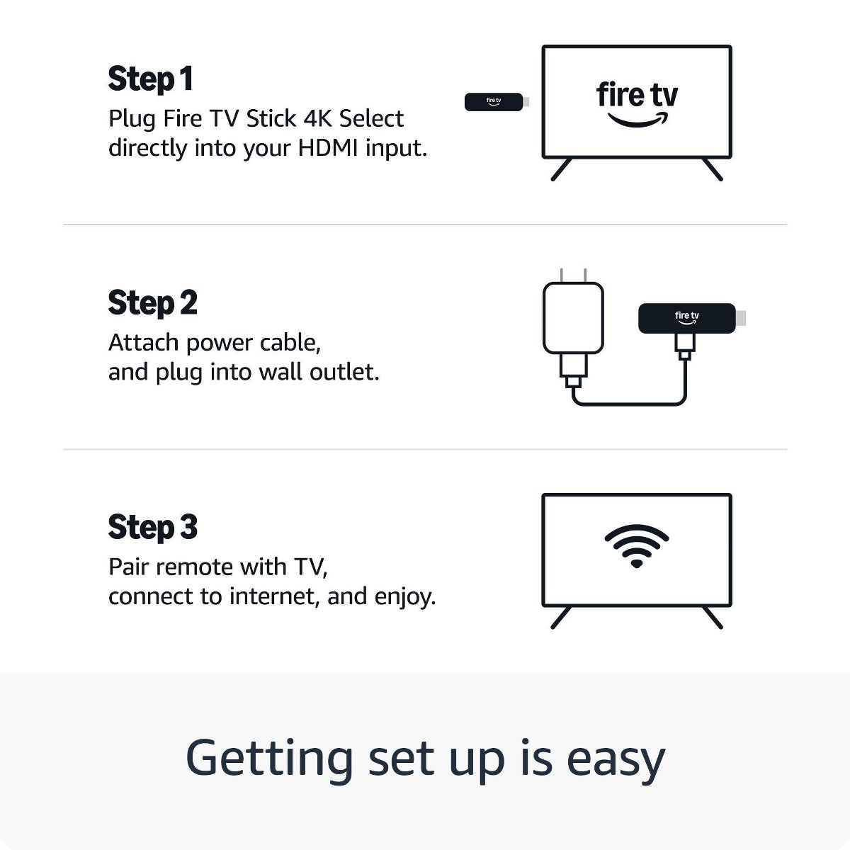 Essential 4K streaming - Get everything you need to start streaming in 4K. It’s easy to find shows fast, get tailor-made recommendations, and more. And it’s all backed by speedy performance that brings your 4K entertainment to life. Where 4K comes to life - Unlock your 4K TV's potential. Smooth performance and sharp picture quality show your 4K entertainment as it's meant to be seen. In the box: Fire TV Stick 4K Select, Alexa Voice Remote, power cable and power adapter, HDMI extender cable for Fire TV Stick 4K Select, 2 AAA batteries, Quick Start Guide.