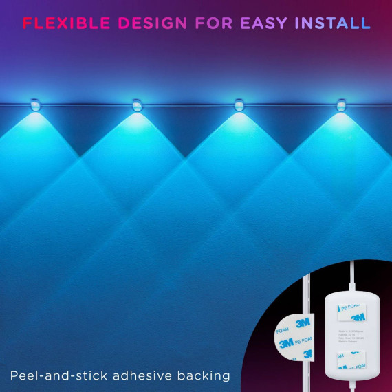 Immerse your indoor space with the color-changing splendor of Enbrighten Indoor Accent Spectrum String Wall Lights. This USB-powered 8ft. strand of six lights is perfect for bedrooms, home theaters, game rooms, kitchens, hallways and more. They provide a multitude of color combinations, dynamic modes and customizable effects to creatively light your space. Each LED is expertly crafted using the highest quality RGBWIC LEDs, providing true-color illumination with full, rich colors. Streamlined and simple lighting controls let you choose how to operate your lights. Simply plug them into a USB-A port or wall adapter, then use the in-line controller or the included infrared (IR) remote control. The 10ft. lead wire provides ample reach to a 5V, 1A minimum USB-A port or a wall adapter. Installation is easy with the 3M adhesive peel-and-stick backing on each light puck. The slim, white cord fits perfectly against flat surfaces and 90-degree corners to blend with your décor. Virtually invisible once installed, these LEDs wash your wall in a cascade of color. Let your creativity shine with the Enbrighten Indoor Accent Spectrum String Wall Lights.