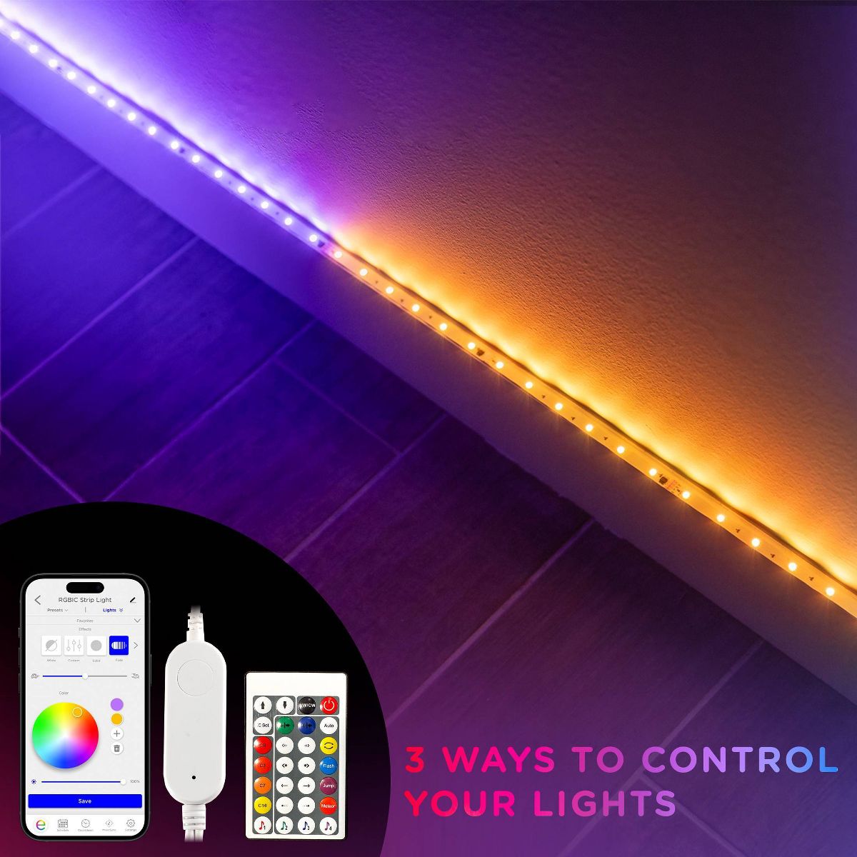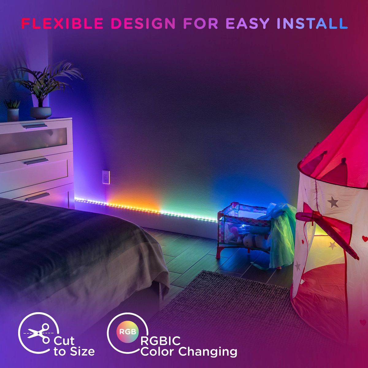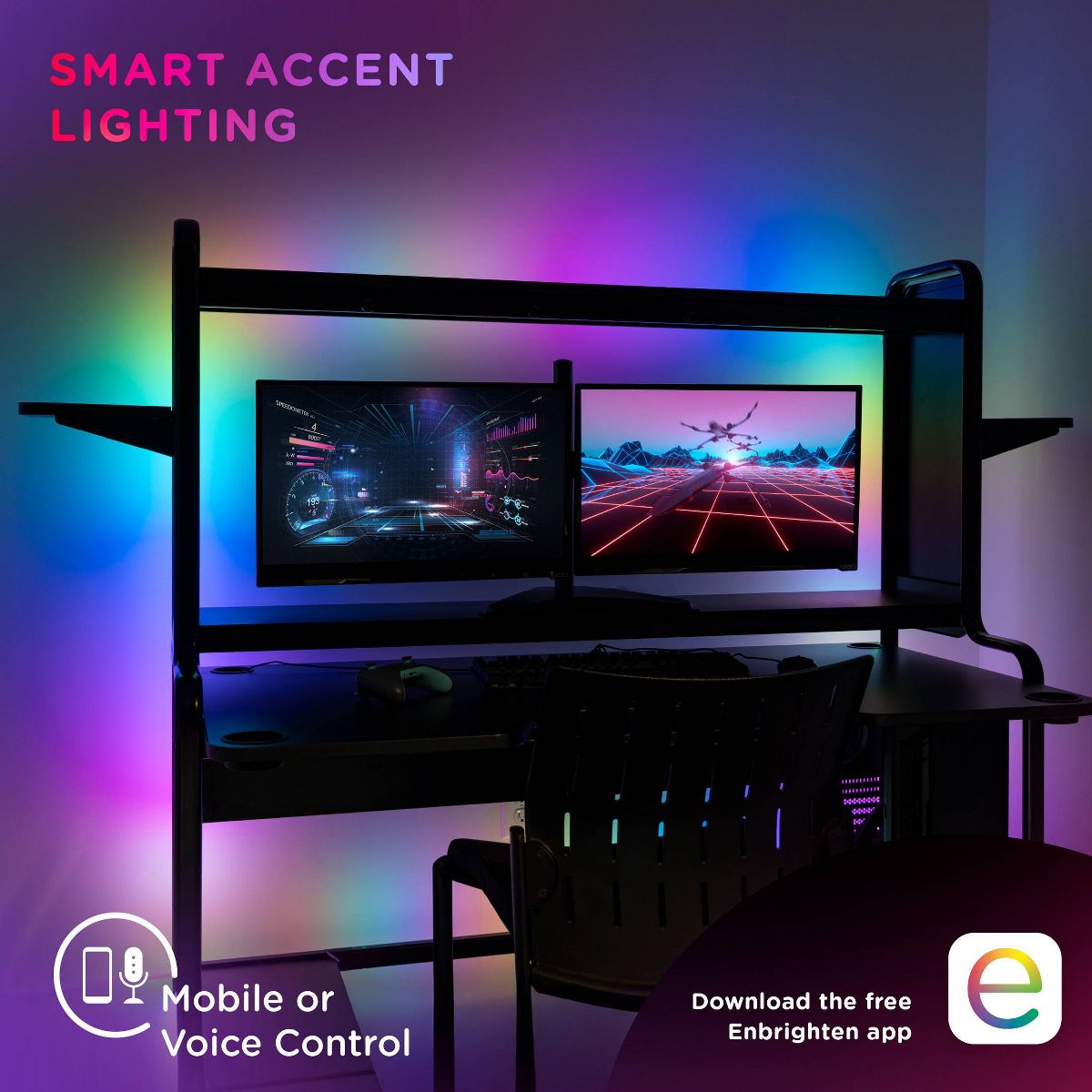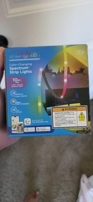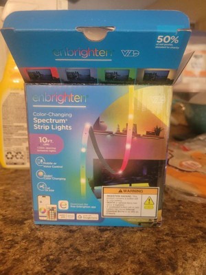 Color your world with Enbrighten VIBE Spectrum Strip Lights! Featuring easy customization and an effortlessly sleek design, this color-changing strip of RGBIC LEDs transforms your space, highlighting your own vibrant style. Using your 2.4GHz Wi-Fi network, experience hassle-free pairing to the Enbrighten app, which is available in the Apple App Store or on Google Play. Through the app, access an impressive array of colors, effects, speeds and preset modes, as well as dimming, scheduling, automations and voice activation with Amazon Alexa and Google Home. Additionally, the in-line controller and infrared (IR) remote control (CR2025 battery included) provide alternate ways to operate your strip lights. This 10ft. light strip can be cut to length and is easy to install indoors on a clean, dry surface using its adhesive backing and mounting clips. These flexible LED tape lights are the perfect way to enhance your gaming station, streaming setup, home theater, living room and more. The thin tape light can easily bend around corners as a colorful accent for desks, entertainment centers and baseboards or extended in a straight line. Experience the fun of smart, colorful indoor lighting with the Enbrighten VIBE Spectrum Strip Lights — where lighting meets lifestyle.