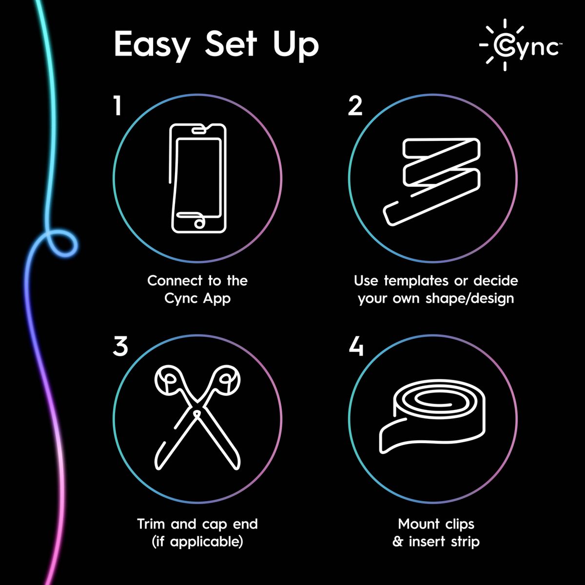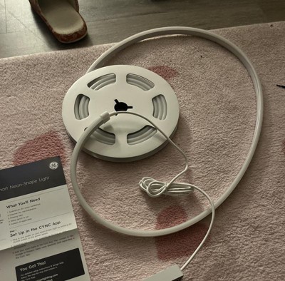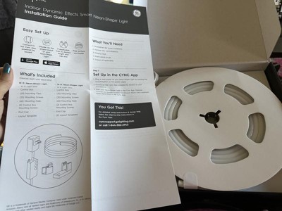 The GE Cync Full Color Dynamic Effects Neon Shape Light lets you bend and curve the strip to create a unique design. Create unique wall art by making shapes, designs, and words with our neon light. This smart light strip features scheduling, light shows, music sync and millions of colors to enhance any space – no hub needed. Select from a wide range of white color tones from 2000K to 7000K and pinpoint the perfect white light. Choose from millions of additional colors with this smart LED strip light to enhance the vibe in the room, ideal for entertaining and holiday décor. Enhance your entertainment space with our LED rope light by selecting a dynamic lighting effect and syncing to music to create the perfect atmosphere for a party, gaming, or working out. Get more out of your LED color changing lights with out of home control and scheduling through the intuitive Cync App, powered by Savant, and voice control when paired with Amazon Alexa or Google Home devices. The light comes with a power cord, control box, and mounting clips.