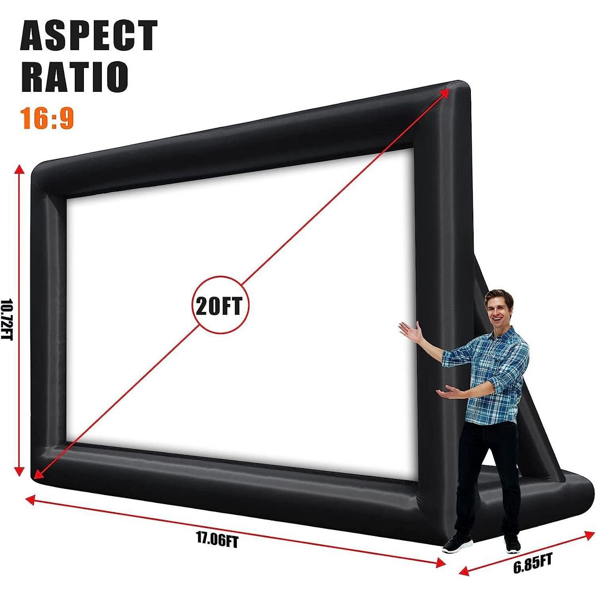 Our 14FT projector screen is ideal for both indoor and outdoor use, such as poolside, backyard, weddings, festive events,football games and parties. You can enjoy a fantastic night with people in the backyard, the beach, or have a camping adventure in the woods.This blow up projector screen , it is flexible, safe and smooth, without traces and no crease after folded. 210D Oxford cloth black frame features a seam-free, super stable and durable for use in all seasons. Easy to maintain and washable.