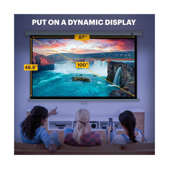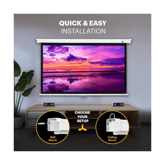 Enjoy big-screen entertainment on a small-screen budget with the Manual Pull-Down White Projector Screen Wall Mount from KODAK. Available in a variety of viewing dimensions, this classic retractable screen projector for room wall provides a dependable surface on which to project your favorite films, streaming shows, video games, as well as photographs and business presentations in stunning widescreen format. Universal styling makes it easy to mount against a wall in minutes or hang from the ceiling anywhere in the room. The wall projector screen roll down heavy-duty hardware and sturdy square casing withstand a lifetime of wear and tear, while the screen’s wrinkle-free matte fabric cleans like a dream (just wait for the credits to roll!).