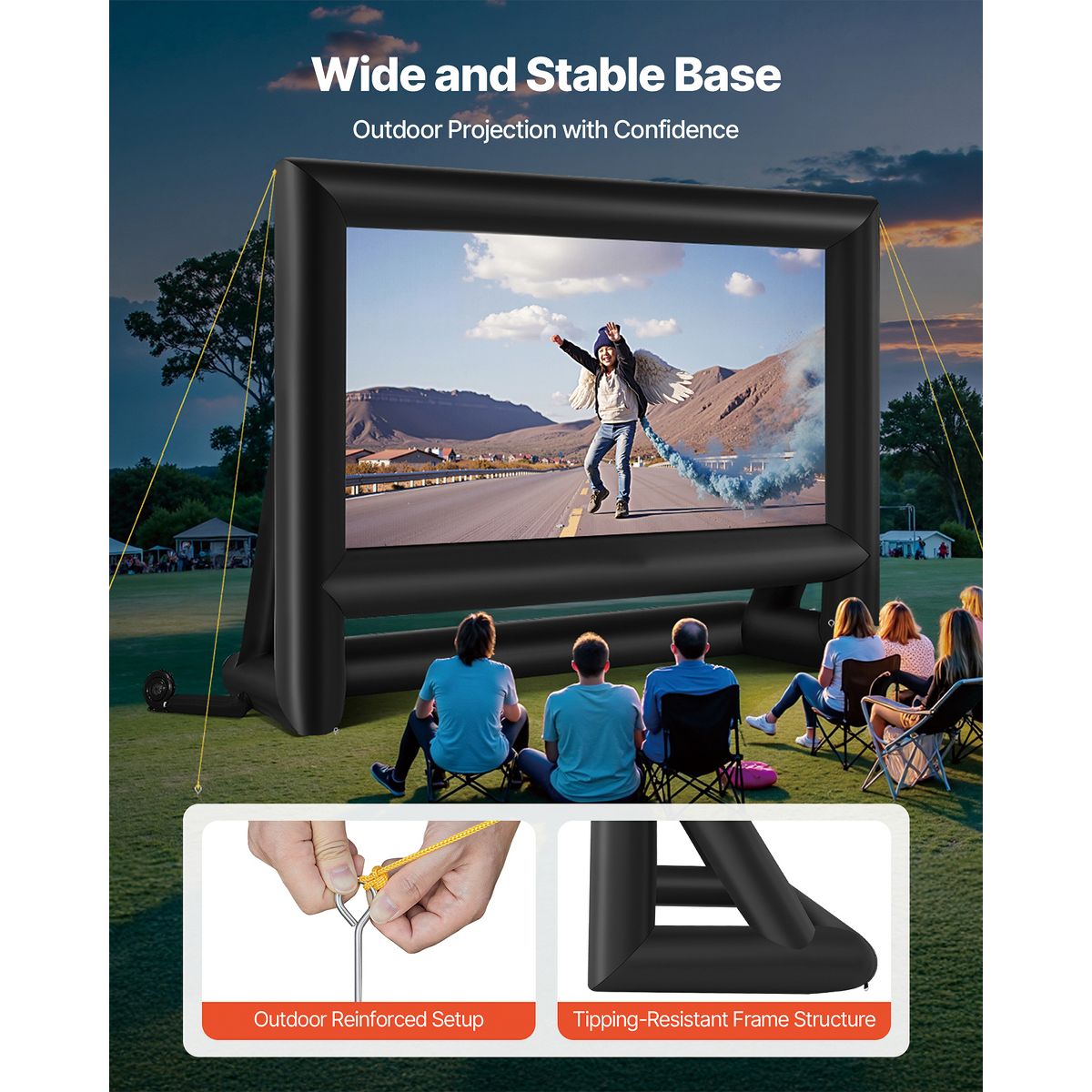 Expansive Viewing Angle: With its wide-angle design, our inflatable screen allows multiple people to enjoy movie nights simultaneously. No matter where you sit, you can easily enjoy a wide viewing angle, immersing yourself in a comprehensive audio-visual experience