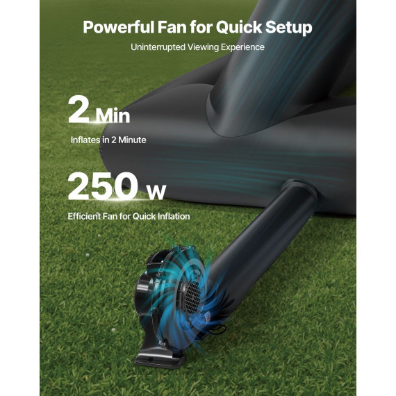 Instant Setup: You can fully inflate this inflatable movie screen in two minutes with our powerful 250W low-noise blower (included) and keeps it extended throughout the show when plugged in. The screen can be deflated and folded easily and stored in a portable bag for space-saving
