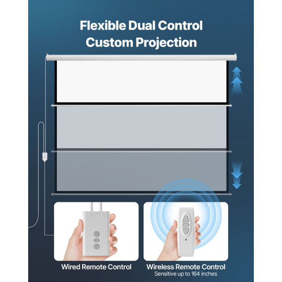 Effortless Control: The projection screen provides 164 ft/50 m wireless remote control and wired panel touch functionality, allowing you to effortlessly adjust the screen height with ease. Experience the convenience of seamless control at your fingertips