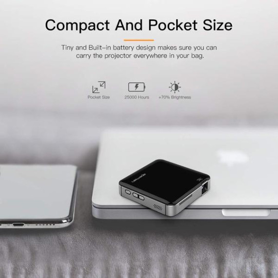 • LIGHTWEIGHT AS PHONES - Pocket size mini projector (3.86x3.86x0.85 inches) and lightweight (0.44 lbs). Easy to take and operate. The mini projector is the best present and ideal for home cinema, parties or camping entertainment with families and friends under a relatively dark environment. Not for business presentation.
