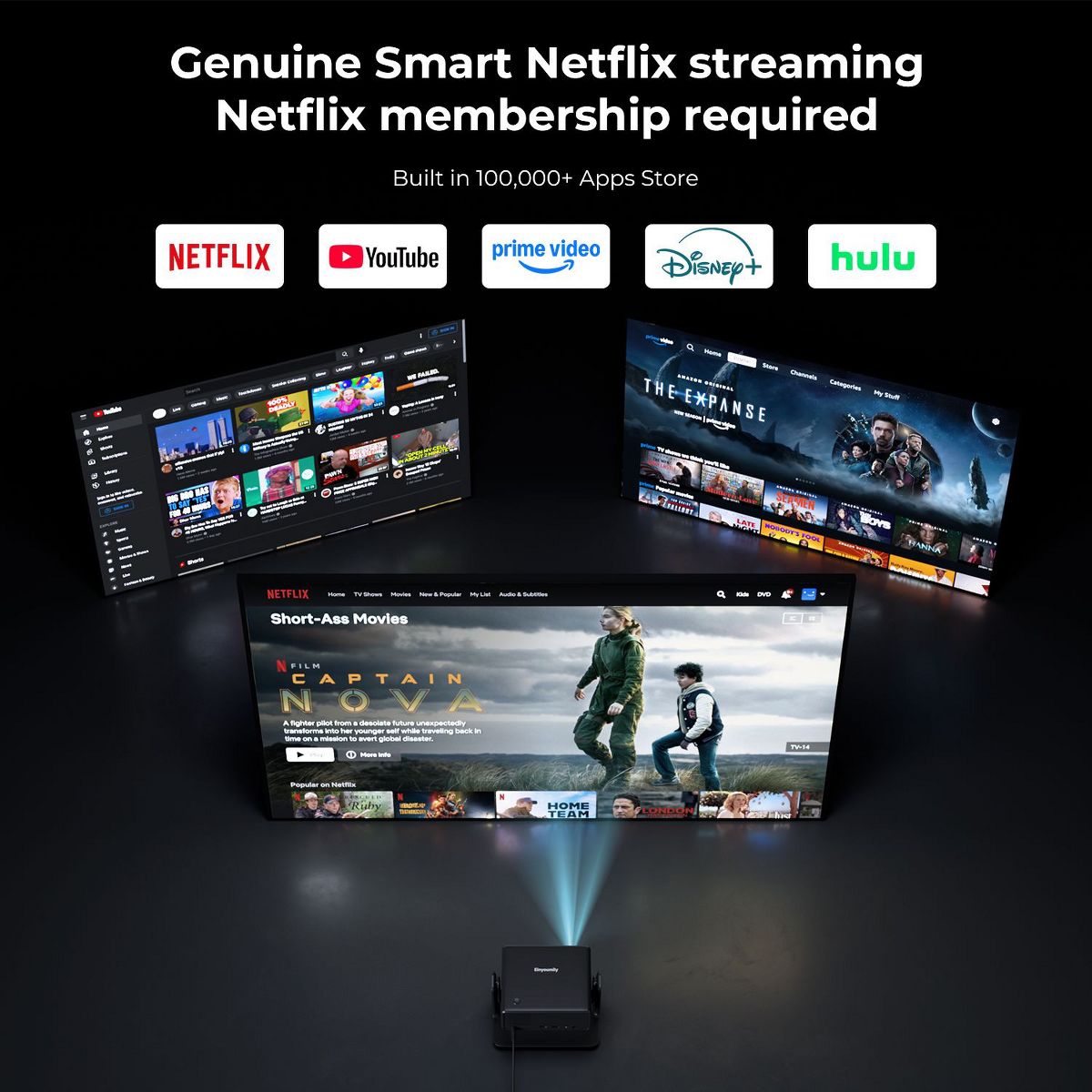 Smart Projector · New Home Theater Experience: This projector is equipped with autofocus and electric 4D/4P keystone correction function, which can present clear and square images when turned on. 1.1 Ultra short focal length projection ratio allows for the projection of a hundred inch screen even in small spaces, coupled with a 280 ° rotating base, making it easy to achieve multi angle projection on ceilings/side walls. Native 1080P high-definition picture quality compatible with 4K decoding, supports 50% -100% electric scaling, and allows for flexible viewing adjustments. Built in WiFi Bluetooth, can wirelessly project screens and connect audio devices, paired with 3D surround sound, instantly creating an immersive audio-visual feast. Built in intelligent system, one click access to massive applications, your efficient entertainment partner is in place!