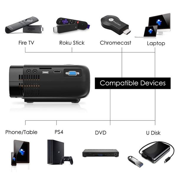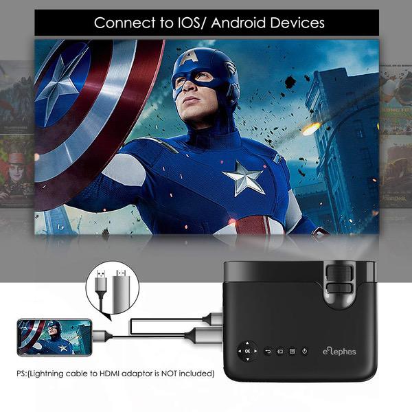 ELEPHAS Mini Projector, Full HD 1080P and 180" Display, 3600 Lux Portable Home Theater Projector with 50,000 Hours LED Lamp Life, Compatible with USB/HD/SD/AV/VGA Interfaces