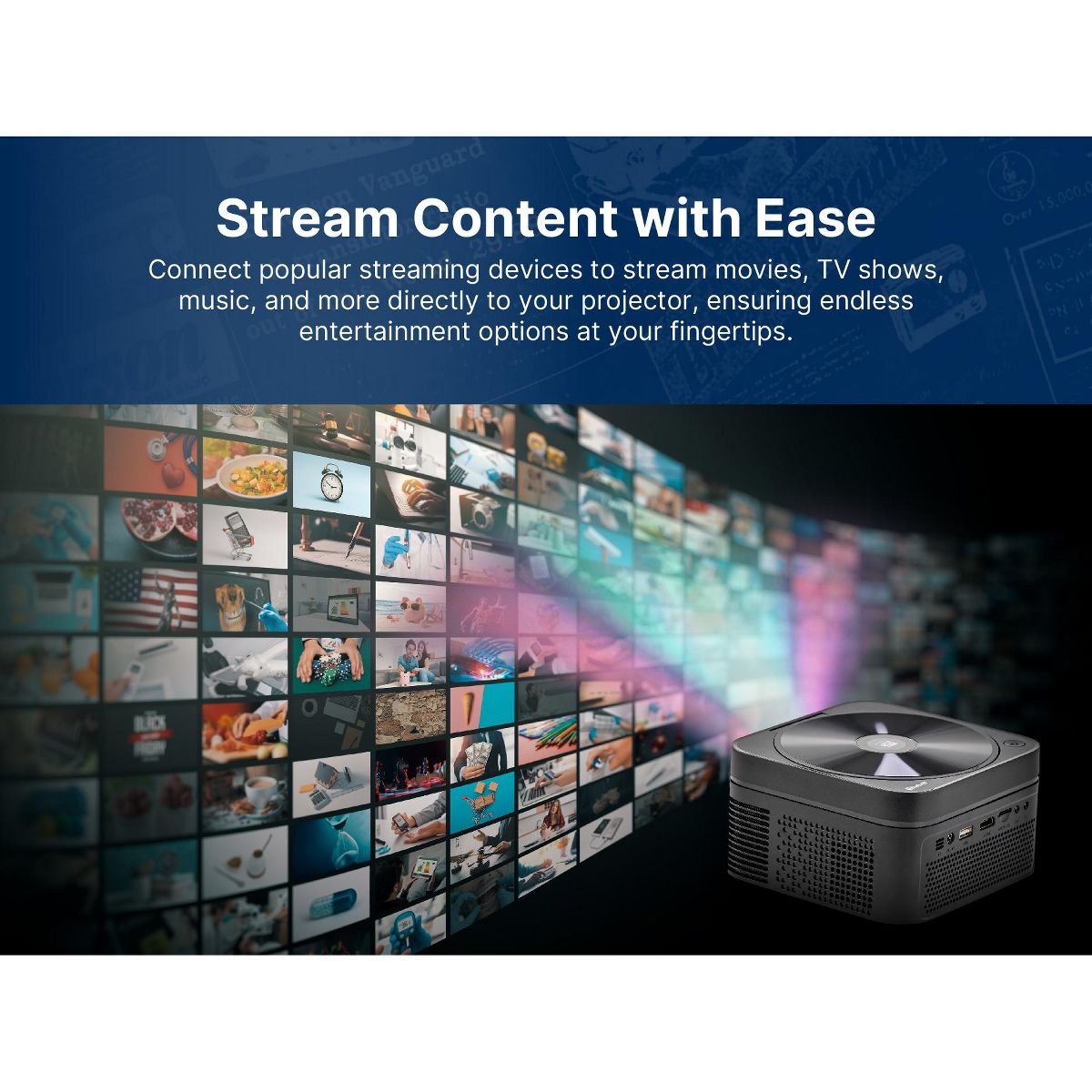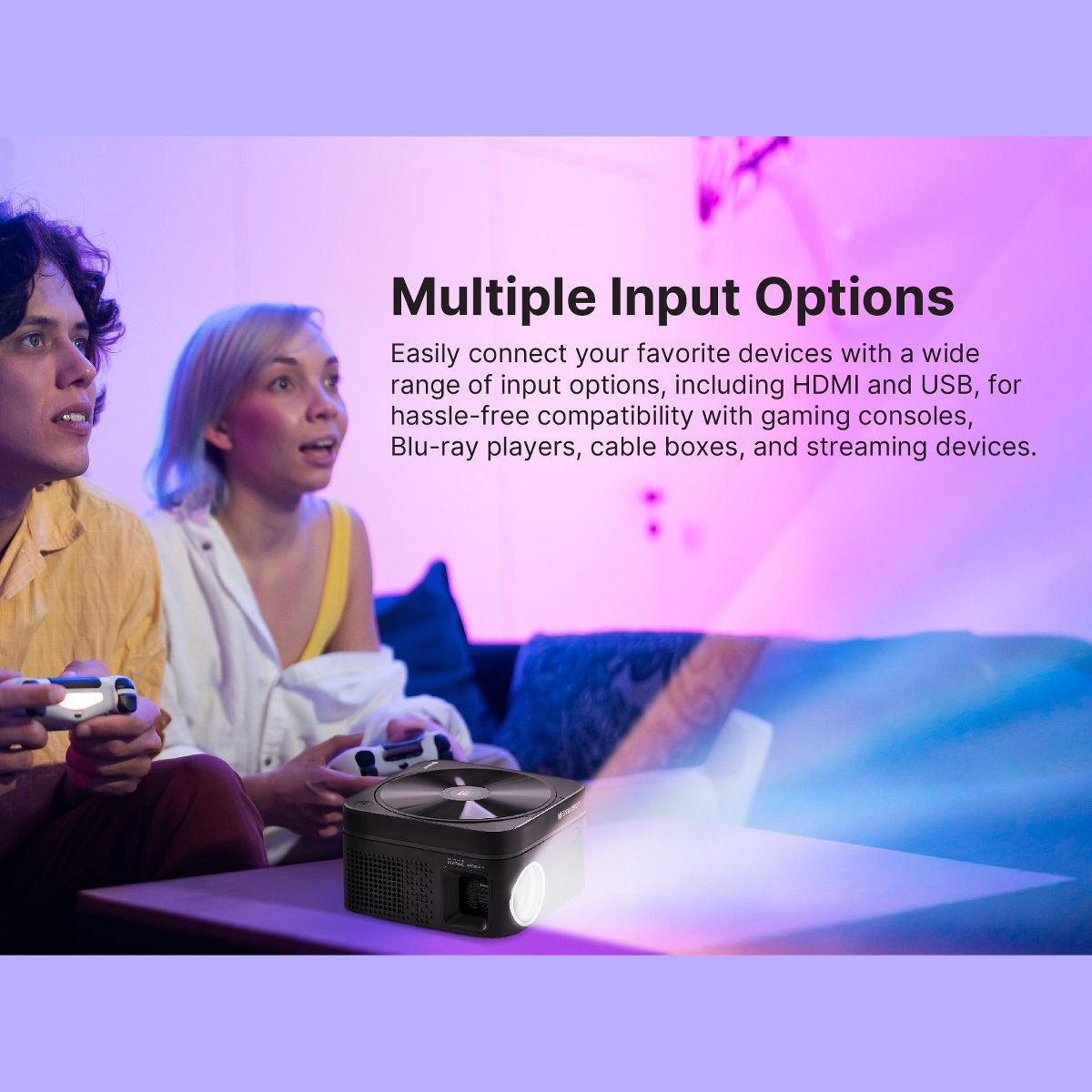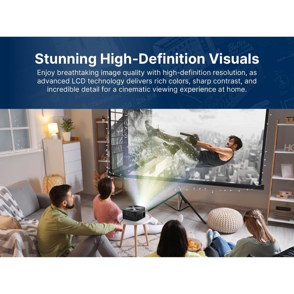 The Projector with DVD Player combines the power of an LCD projector with the convenience of multimedia playback in one sleek device. With a 720P native resolution and up to 100 Ansi Lumens brightness, enjoy crystal-clear images on large screens from 32" to 120". Stream media through a variety of sources, including USB flash drives, Micro SD cards, HDMI, or AV IN, or connect your favorite streaming devices such as Roku®, Amazon® Fire Stick, or Google® Chrome Stick (devices sold separately). The built-in speakers provide great sound, while the 30,000-hour LED bulb ensures long-lasting performance. Control the projector from the comfort of your couch with the included remote control. Whether you’re watching movies, playing games, or enjoying your favorite shows, this projector offers a versatile and immersive experience for all your entertainment needs.