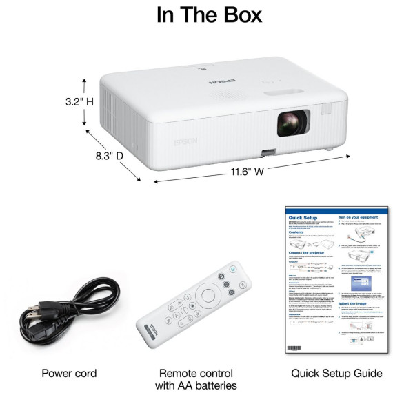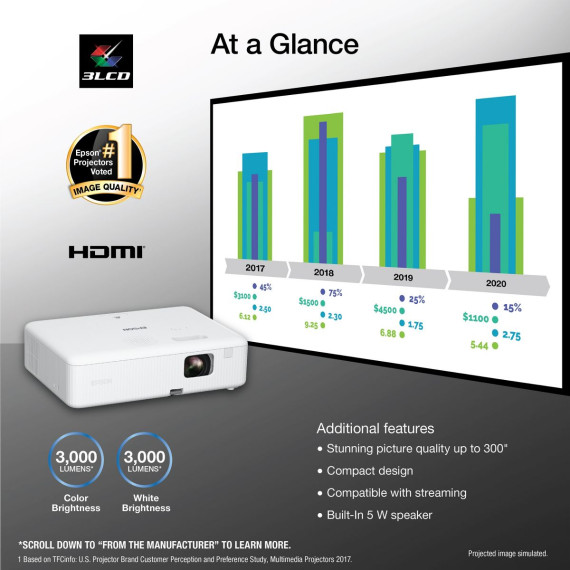 Enjoy versatile projection for remote work, home entertainment and beyond with the Epson EpiqVision Flex CO-W01 Portable Projector. Designed to bring more ease and convenience to your workday, the Epson EpiqVision Flex CO-W01 Portable Projector delivers a widescreen picture up to 300"—that’s four times larger than a 75" flat panel—for collaborative online meetings and detailed presentations. Perfect for engaging at-home learning, immersive movie watching and more, this 3,000-lumen projector offers Best-in-Class Color Brightness to deliver crisp, colorful images in virtually any lighting environment—even during the daytime. Sleek and compact, this portable projector can be easily carried in bags and backpacks for easy viewing virtually anywhere. And, with a built-in HDMI port and speaker, you can conveniently stream movies, TV shows and more using your favorite streaming device for a truly amazing viewing experience.