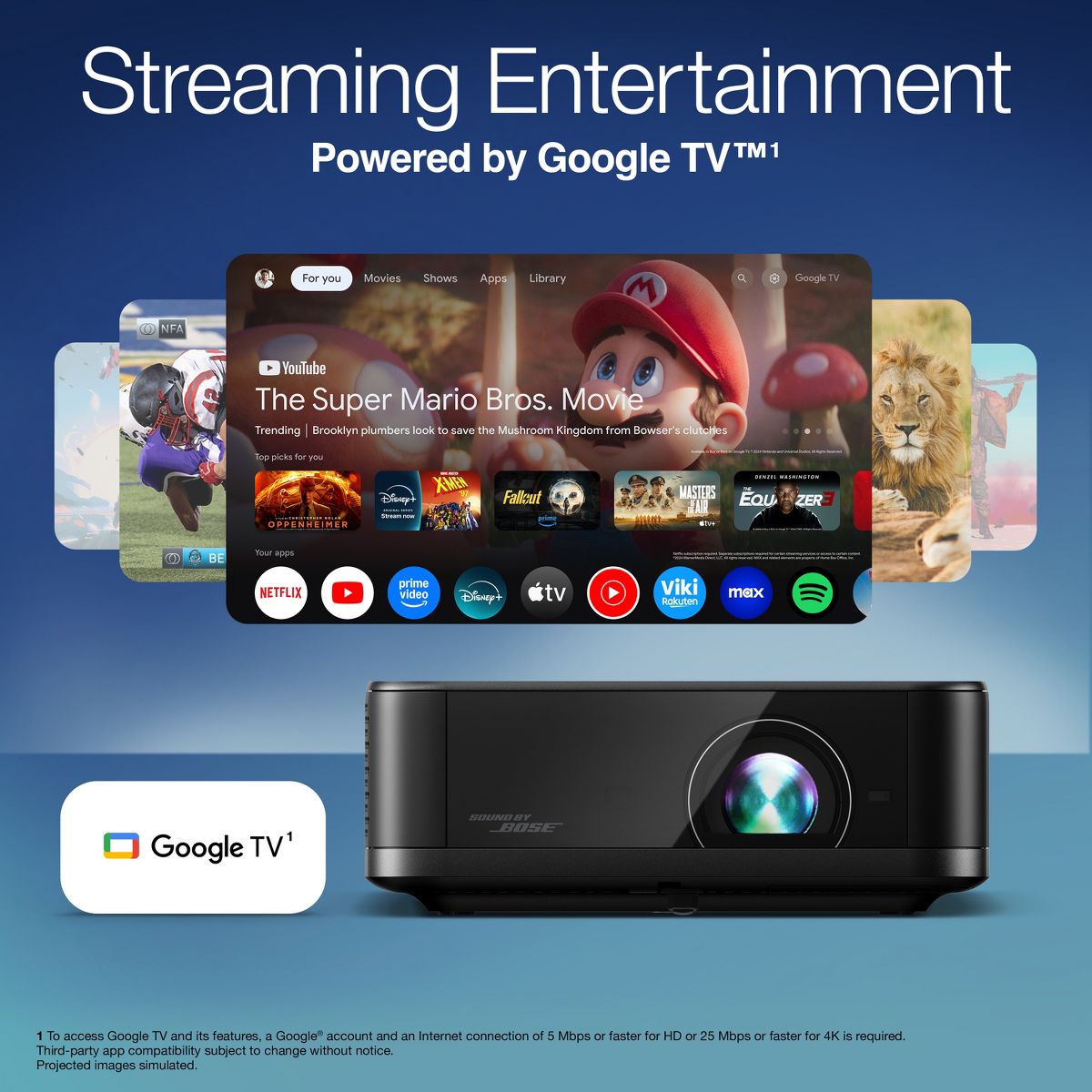 Enjoy immersive sound that fills the room with the world’s first smart streaming projectors featuring Sound by Bose technology. The custom-designed stereo system creates audio you can feel, delivering rich, balanced sound, pulling you—and everyone around you—right into the action.