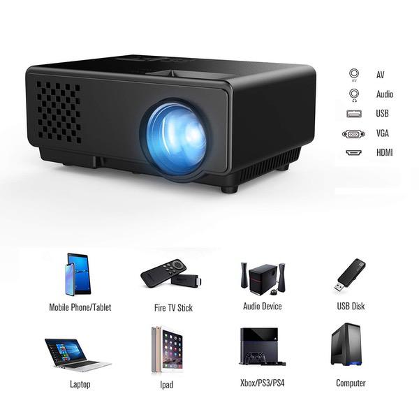 • MULTIMEDIA PORTABLE PROJECTOR: Movie projector has HDMI, AV, VGA, USB supports which allows it can be connected to PCs, laptops, smartphones, tablets, USB drives, DVD players, ROKU, Amazon Fire TV Stick, Xbox and Apple TV. ( Wireless HDMI Dongle not included)