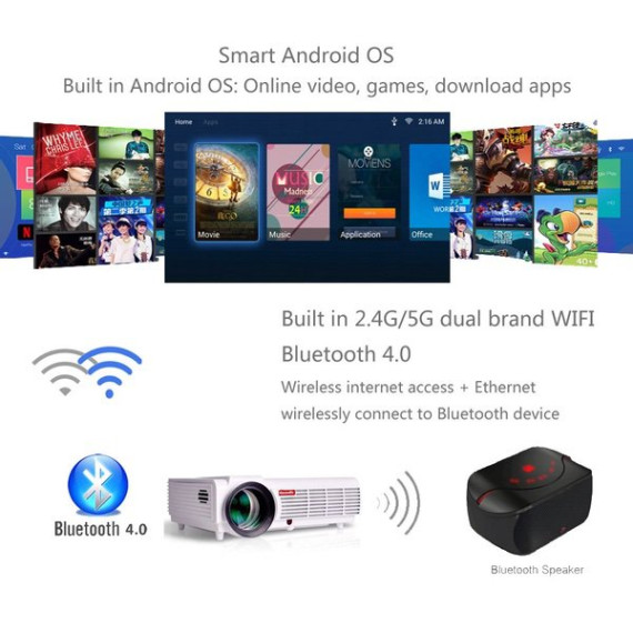 Gzunelic 4200 lumens Android WiFi 1080p Video Projector LCD LED Full HD Theater Proyector with Bluetooth Wireless Synchronize to Smart Phone by Airplay Miracast Ideal for Home Entertainment
