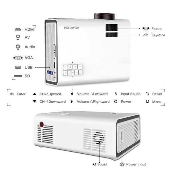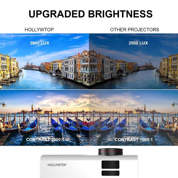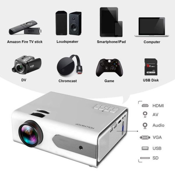 HOLLYWTOP HD Mini Portable Projector 2800 Lux WiFi Wireless Synchronize Smart Phone Screen,1080P Supported 180" Display, Multimedia Connections, Compatible with Laptop/PS4/Fire TV Stick/Computer/DVD